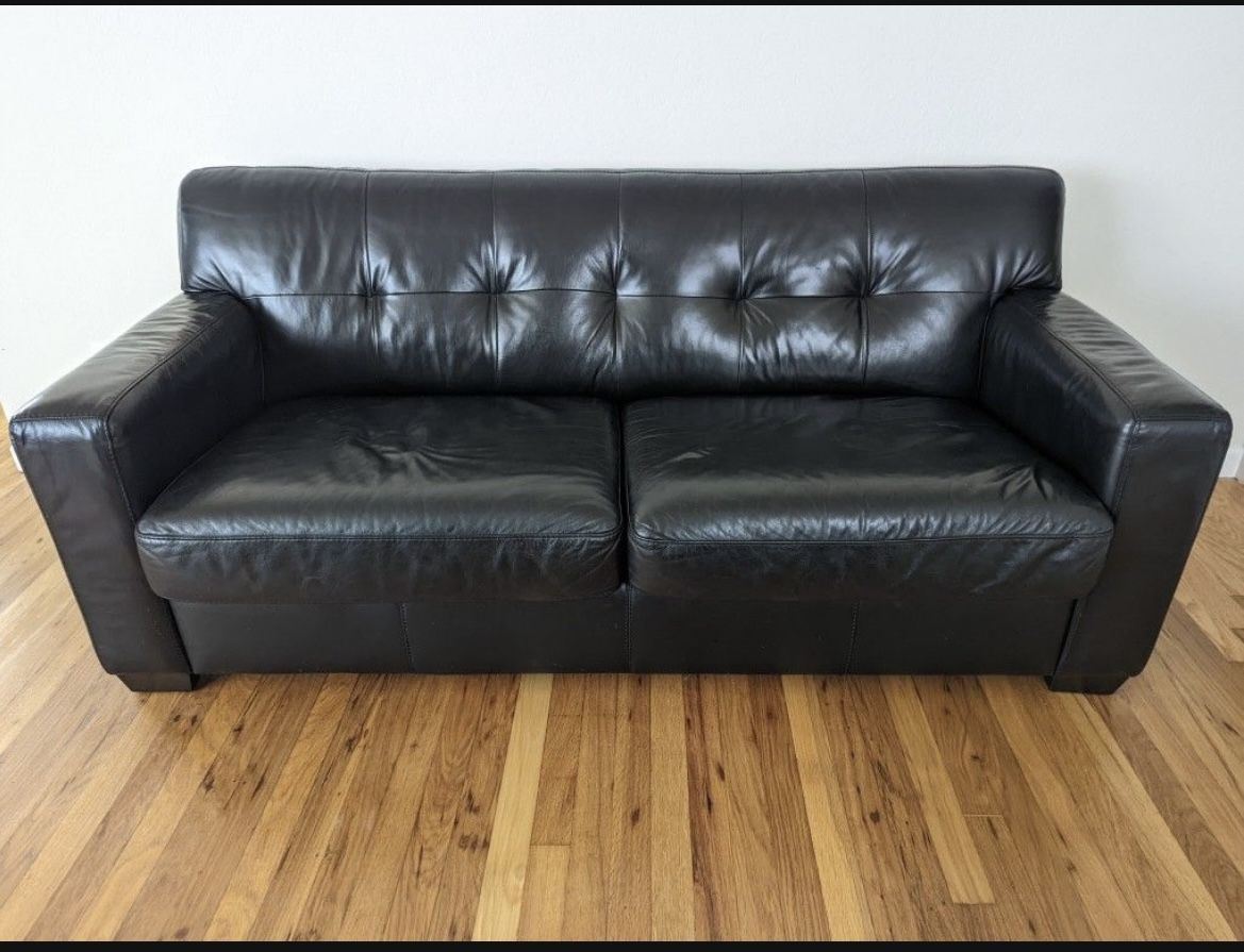 Black faux leather pull out couch. Comfortable couch, and comfortable pull out mattress. In good condition. Couch: Length: 76” Height from ground: 33.5” Width: 35.5” Pullout mattress: Length: 70” Width: 55” Height: 22”