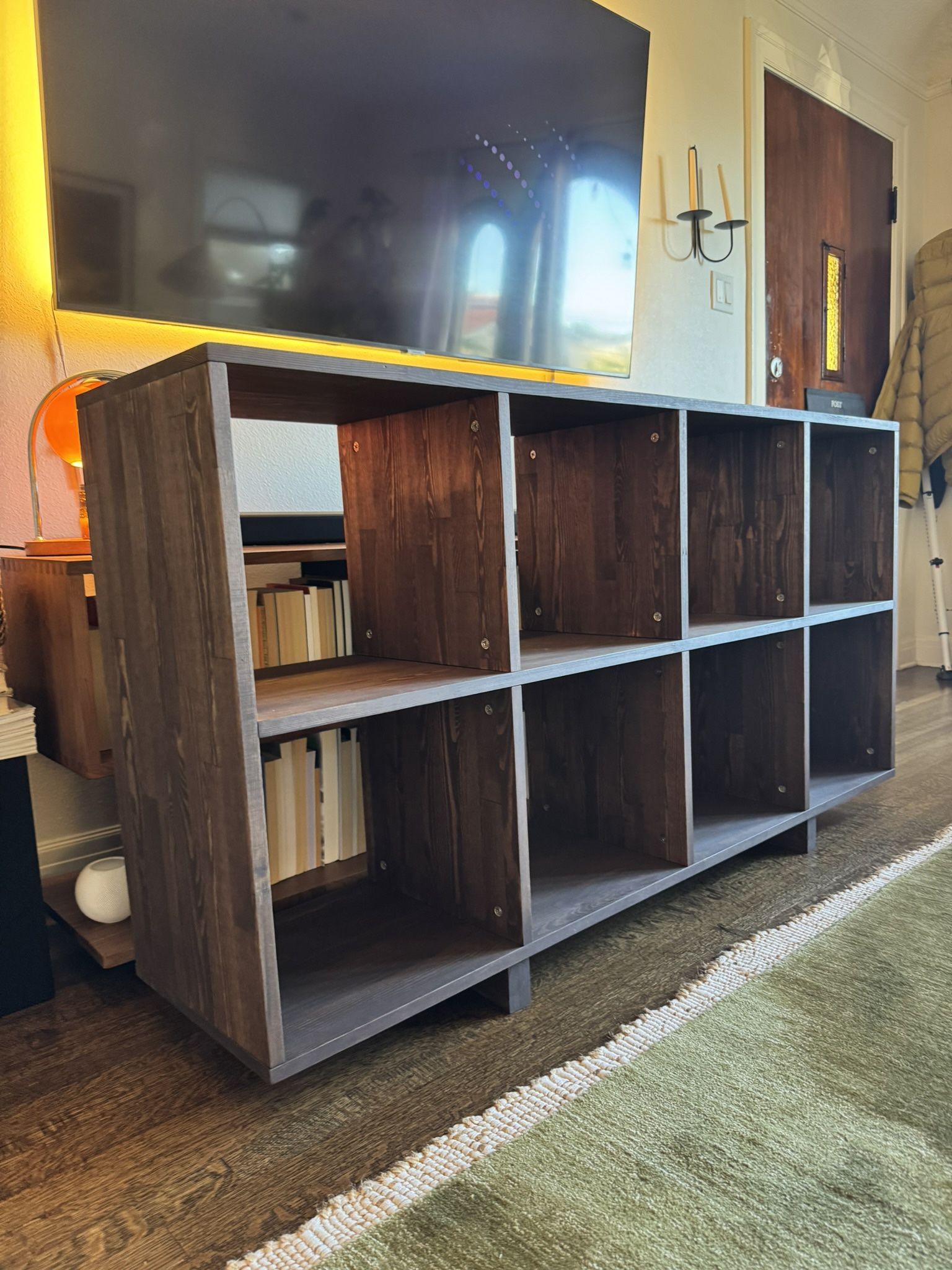 Solid Wood, Walnut stain. Purchased this only 2 months ago- it doesn’t work in my space. BRAND NEW. 440 OBO Dimensions Width: 59" Depth: 14" Height: 32" Here’s the original link: https://offerup.com/redirect/?o=aHR0cHM6Ly9zdG9mZm1vYmVsLmNvbS9wcm9kdWN0cy9yZWNvcmQtcGxheWVyLXN0YW5kLTMtdGllci1tb2Rlcm4tYm9va3NoZWxmLXZpbnlsLXJlY29yZC1zdG9yYWdlLXR1cm50YWJsZS1zdGFuZC1yZWNvcmQtY2FiaW5ldA== Crafted from solid pine wood, this versatile stand offers two levels of open shelving for vinyl records, books, and audio equipment. With a spacious and accessible design, it’s perfect for showcasing your collection while keeping essentials organized. The clean, Scandinavian-inspired lines bring a modern touch to any room, making it ideal for music lovers and minimalist decor enthusiasts.