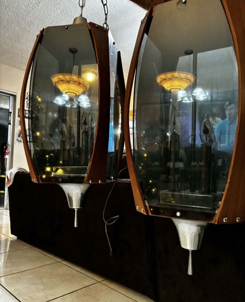 Pair Of Vintage Mid-Century Modern Smoked Acrylic, Walnut and Chrome Pendant Light