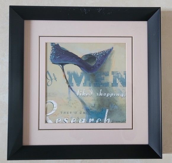 Print with high-heeled shoe picture that says “If Men Liked Shopping They’d Call It Research.” Measures approximately 13.5” x 13.5”. Small slight scratches on top of frame.