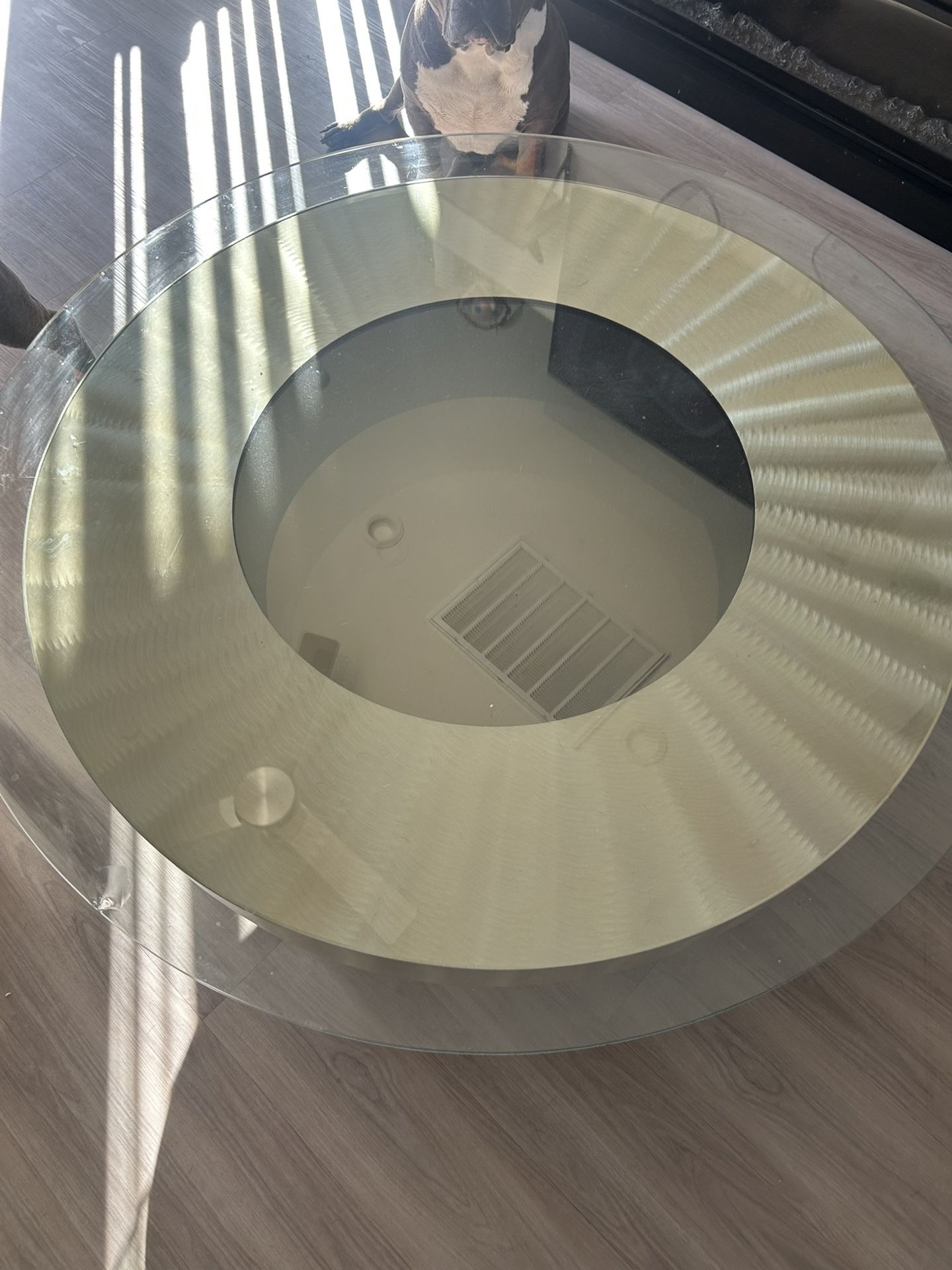 The glass does have a chip in it from the recent move otherwise works great battery powered so there are no cords crossing your living room