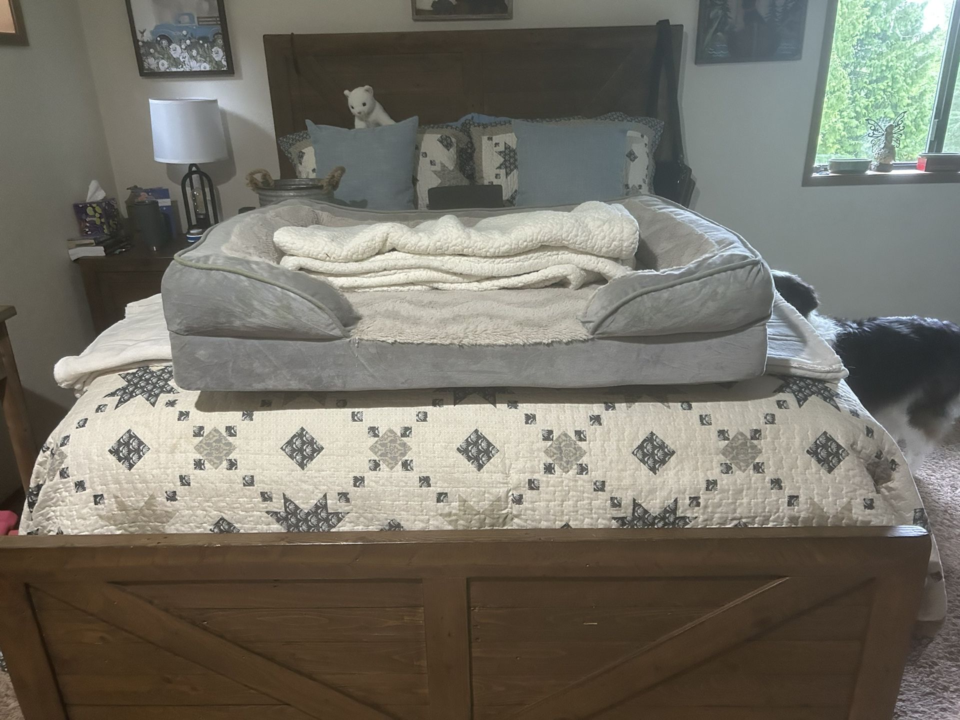 Queen size bed, head & footboard along with side rails and 1 end table all in great condition and only 4 years old, will toss in a box spring if wanted, $200 obo, thx for looking