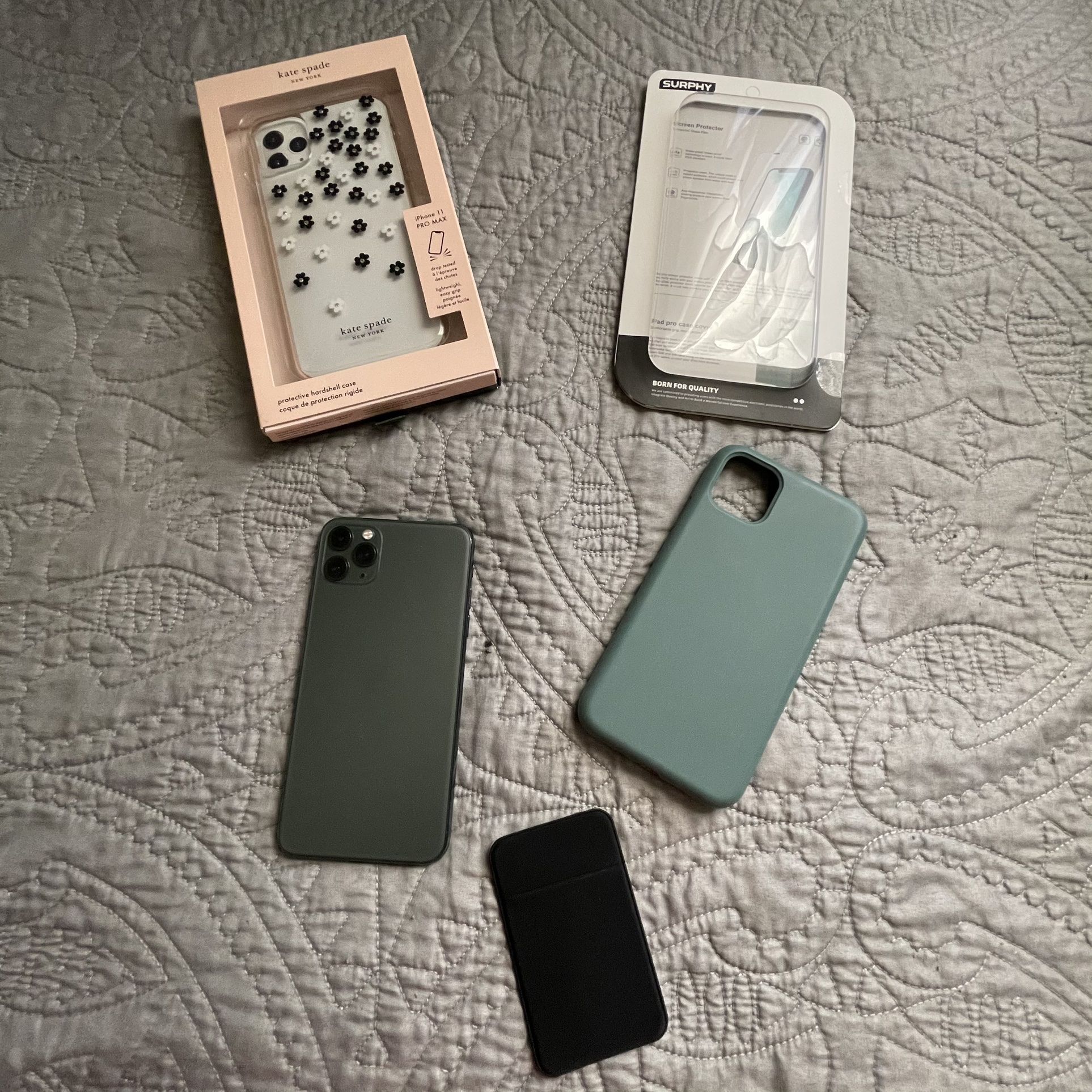 I am selling an iPhone 11 Pro Max Specs -64 gbs -beautiful green color -original Oled screen -three perfect cameras Comes with -APPLE CARE! payed for until 7/30/21 -NEW never used Kate spade case! -Super cute green silicone case that matches the phone it is slightly used but I still have the box for it -card holder that sticks on the back of a case or the phone itself Details -98% battery health lasts all day!! -It has been very well taken care of. It has never been used without a case or a screen protector. -I’ve never had a single bit of lag with this phone!
