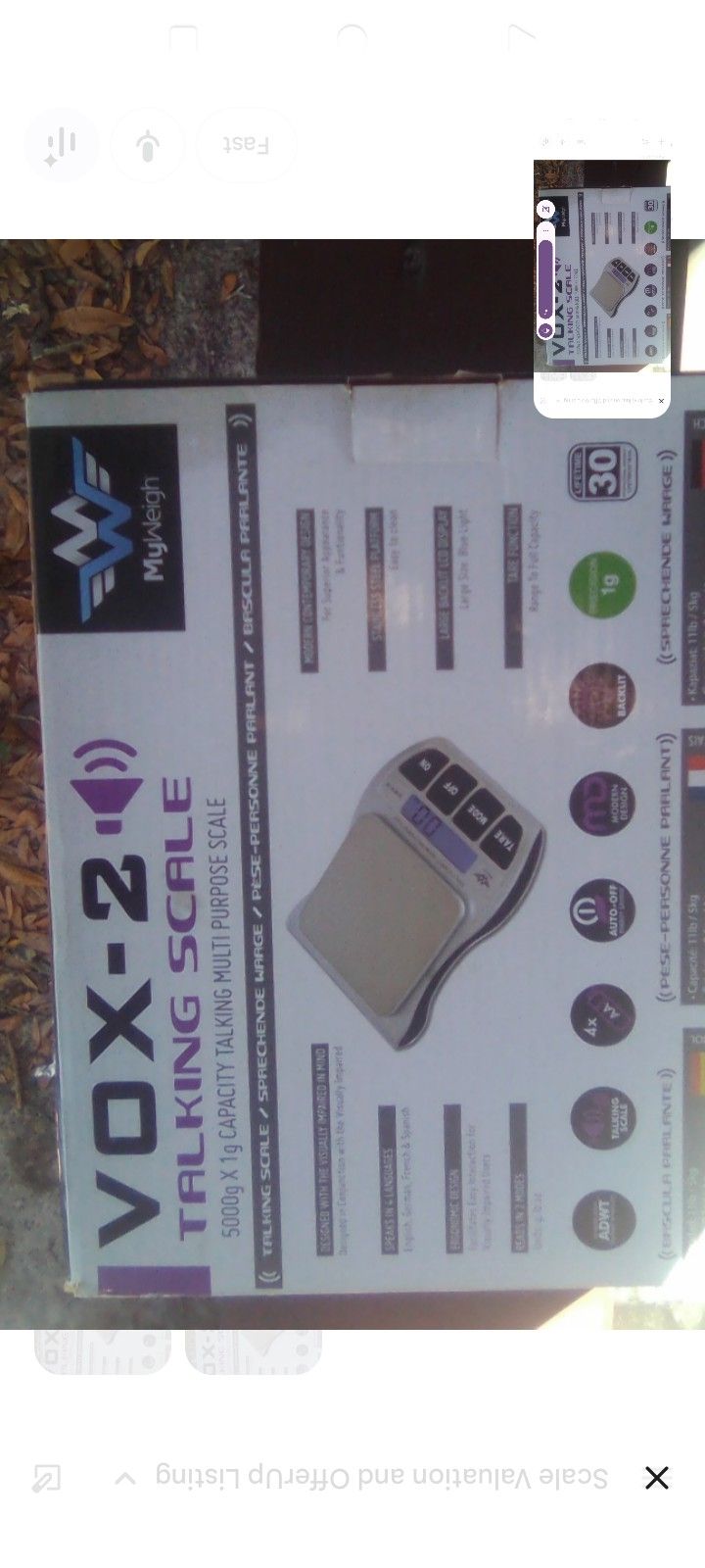 For sale is a brand new (My Weigh VOX-2 multi-purpose Talking Scale. This is high quality, professonal-grade Scale designed for easy use by everyone, including the Visually impaired. Great for the Kitchen, mailroom, hobbyists! Key features .Talking function: Speaks in 4 Languages ((English: Spanish,French,German).High Capacity:Weighs up 5000g(111bs) with 1g precision.disply. High Quality: Stainless Steel Weighing platform and ergonomic design. Functions: Includes Tare and Auto-off features to save battery. Power: runs on 4AA batteries(included (included ) perfect for anyone. Who needs accurate Measurements with the added Convenience of voice read out.condition: New in box/Excellent condition.Pric$40.00(pick up in Jacksonville 5841 Normandy Blvd
