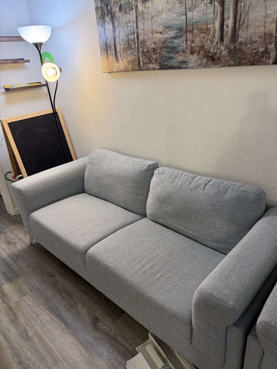 Light gray sofa and armchair set. Both are very soft, comfortable, and lightweight — easy to move and perfect for any living room. The sofa was professionally cleaned and looks great. The armchair is in good condition but has not been cleaned. ✔️ Soft and comfortable ✔️ Lightweight and easy to move ✔️ Neutral color fits any interior ✔️ Sofa professionally cleaned Available for pickup in Glendale.