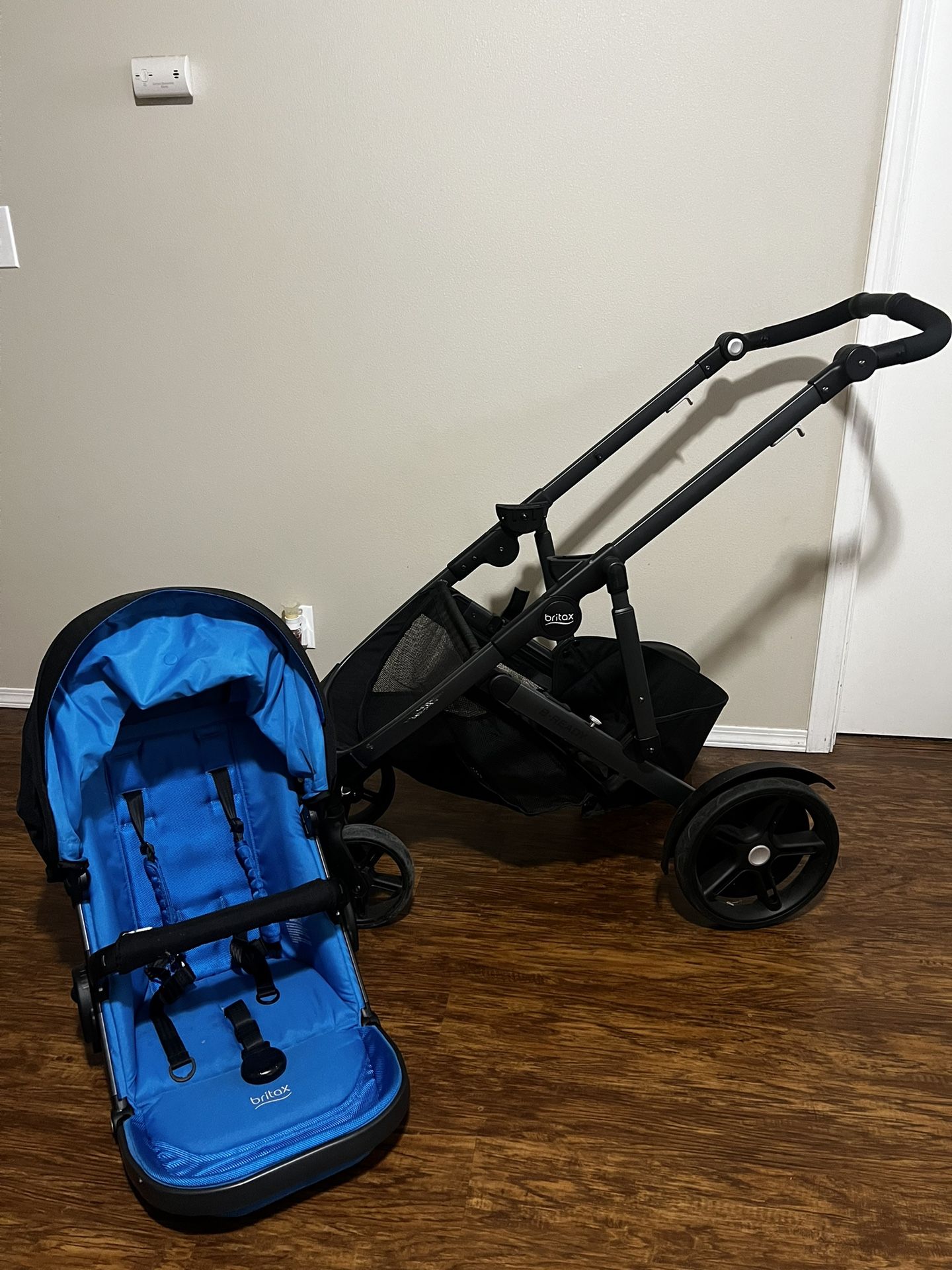 Used Britax stroller for sale. Adjustable push bar and foot rest. Can make seat parent-facing or forward-facing and includes three different recline positions. Decent storage space. Comes with infant car seat adapter. However, the latch to lock stroller in place is broken.