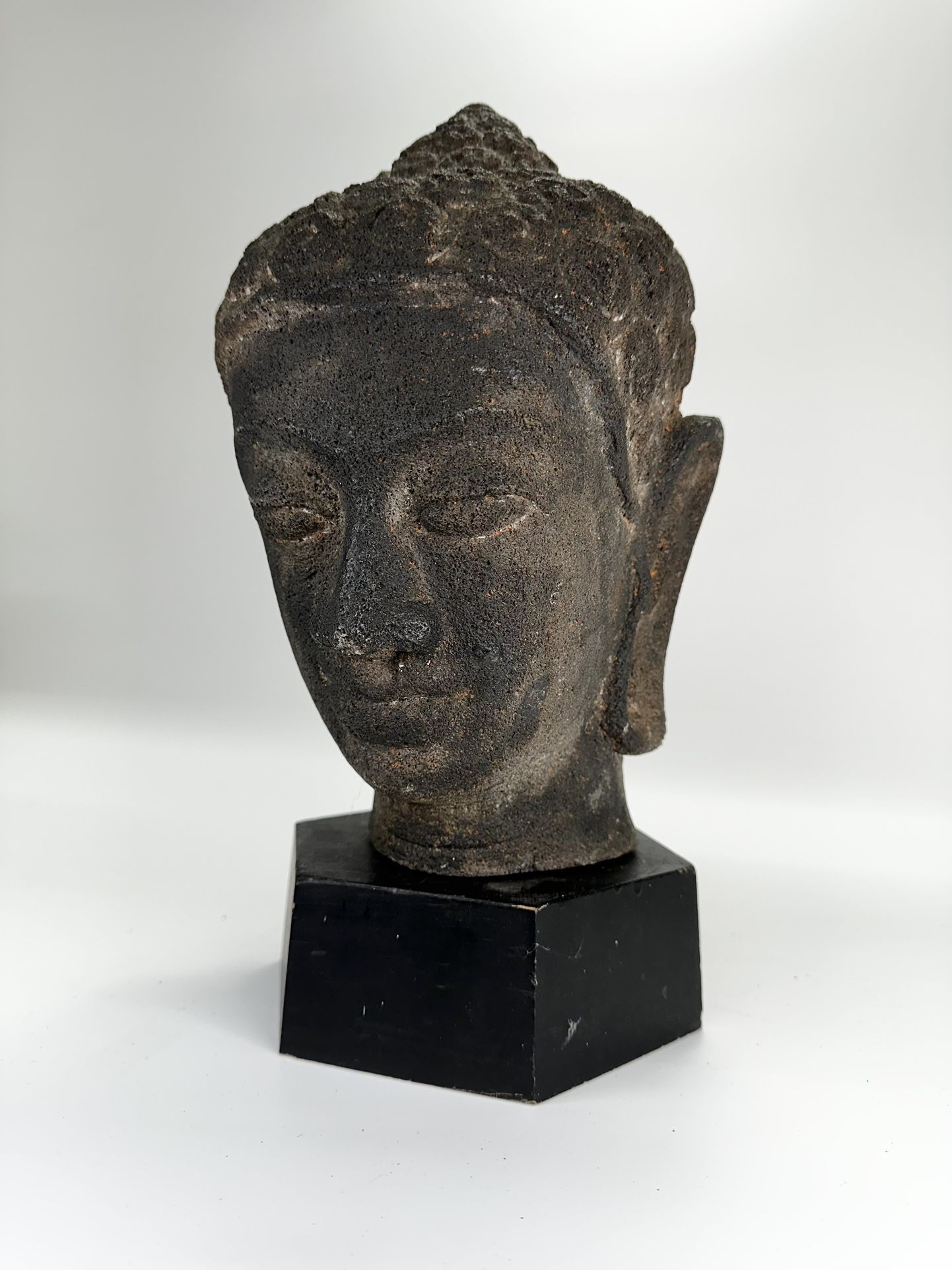 This is a stunning southeast Asian black volcanic rock Buddha head statue. It has a very calm and serene looking face. The dimensions of it are in the photos, same with the weight. The stone is coded with some kind of waxing material in order to bring out the details on the face. Comes with a little rosewood, stand for it as well. Came from a large Asian Antiques collection in San Francisco California. I believe it to be from either the late 1800s or early the 1900s. Take a look at the photos to see condition, dimensions, weight.