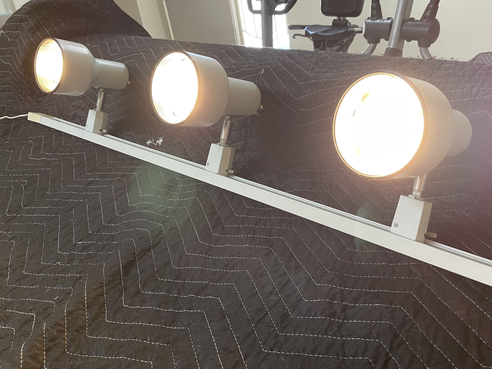 As is, as shown. For the person that wants that retro look, with larger individual light buckets, 60 W bulbs shown. Can be used with any switch-controlled outlet. Or, for a few dollars, you can buy a switch to splice into the wire (10 minute job). I never bothered. 🙂. Light buckets can be moved anywhere along the track. The last two pictures show the levers involved in removing and fastening in each light unit. With the lever in the 12 o’clock position, each light unit c my an be inserted into the track or removed. Move it to the 3 o’clock position, and it’s locked into place on the track! Takes three full-size lightbulbs up to 75 Watts each . Included are three 60 watt lightbulbs. 14 foot electrical cord . You’ll need screw and wall anchor sets. Those were lost to antiquity when I took down the lighting. Pick up in Whittier after 2 PM weekdays, after 2 PM Saturday, or before 2 PM Sunday