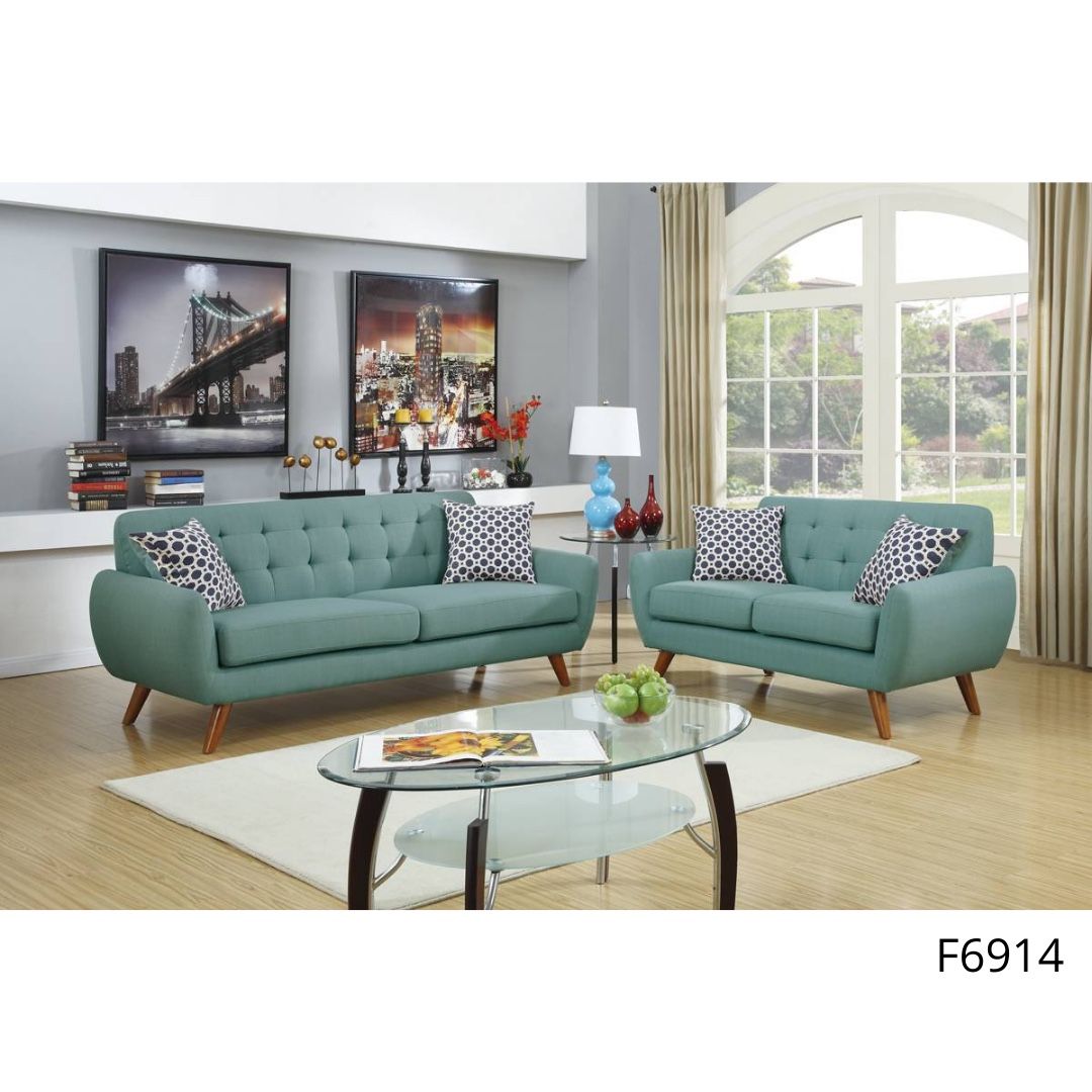 Sofa & Love Seat Item # F6914 Color: Sky Blue Peg-Style Leg Accent tufting Plush seating Accent Pillows Included Available in Grey, Ash Black, and Sky Blue Materials: Polyfiber Plywood + Solid Pine Foam, Fiber Battings Dimensions: Loveseat 60″ x 35″ x 33″ H Sofa 82″ x 35″ x 33″ H