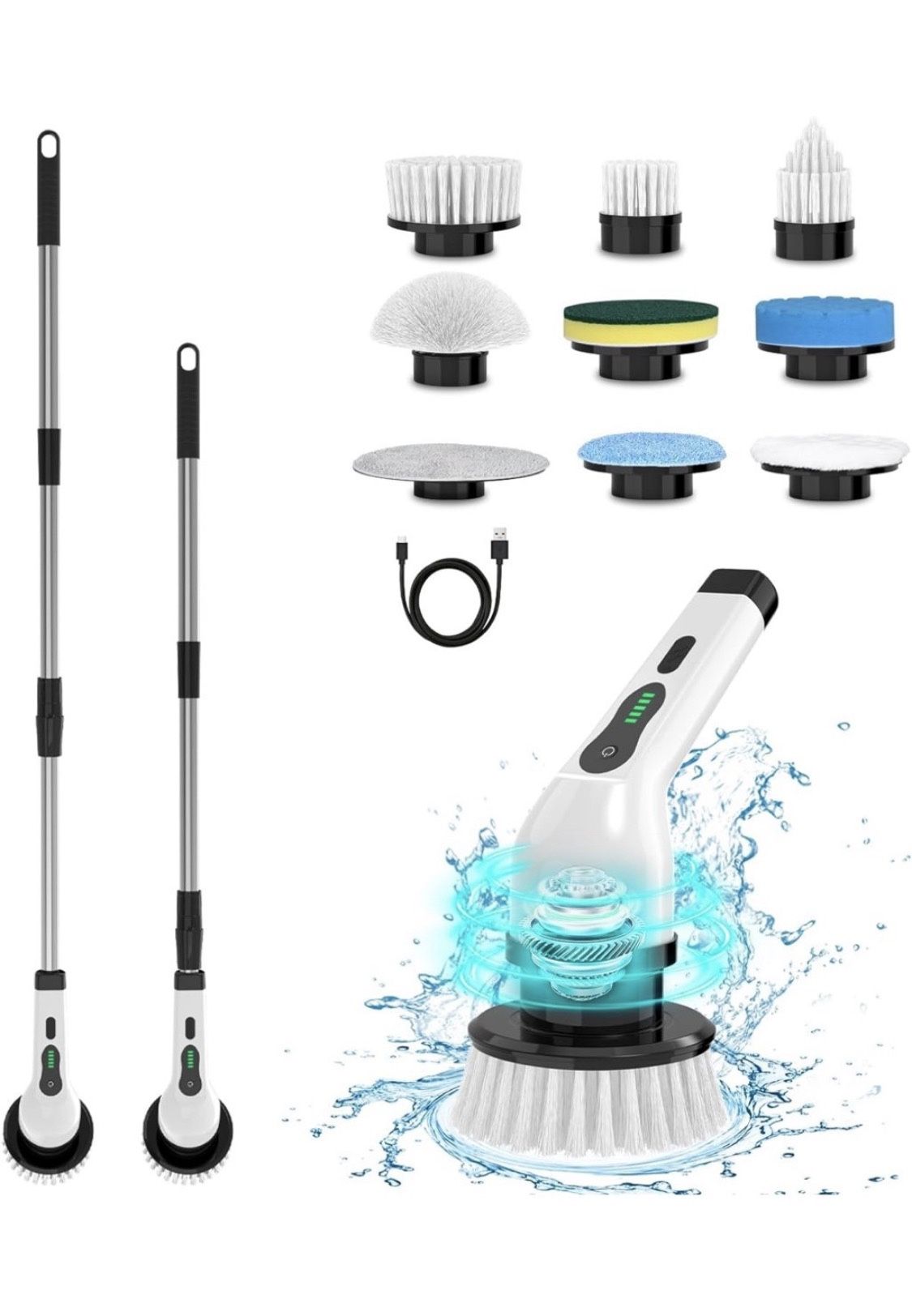 Electric Spin Scrubber, Adjustable Cordless Power Bathroom Scrubber, IPX7 Extension Arm, 9 Brush Heads 3 Speeds 150mins Work Time for Cleaning Shower Bathroom, Kitchen, Tub, Floor and Tile electric spin scrubber includes 9 replaceable cleaning brushes for various scenarios. Big brush for surfaces like tile floor, wall, and pool; Tip brush is great for cleaning grout, faucets, edges; Semi circular brushes for cleaning bathtub and toilet; Small round brushes for detail work; Cloth brush for leather, wooden floor and furniture cleaning; the sponge is for the window; Coarse fiber brush for oily areas, barbecue grill, Kitchen Ventilator Gas Cooker; Wool-like Brush for car polishing; Type-C Fast Charging & 2500mAh High-Power,Charge for 3 hours and enjoy up to 1.5 hours of continuous use. A single charge handles 2-3 deep bathroom cleanings. 2 Speeds Control, Retractable handle, brush set has 2 working speeds, ① Low Speed: 360RPM; ②High Speed: 450RPM; All you need to do is press the ON/OFF