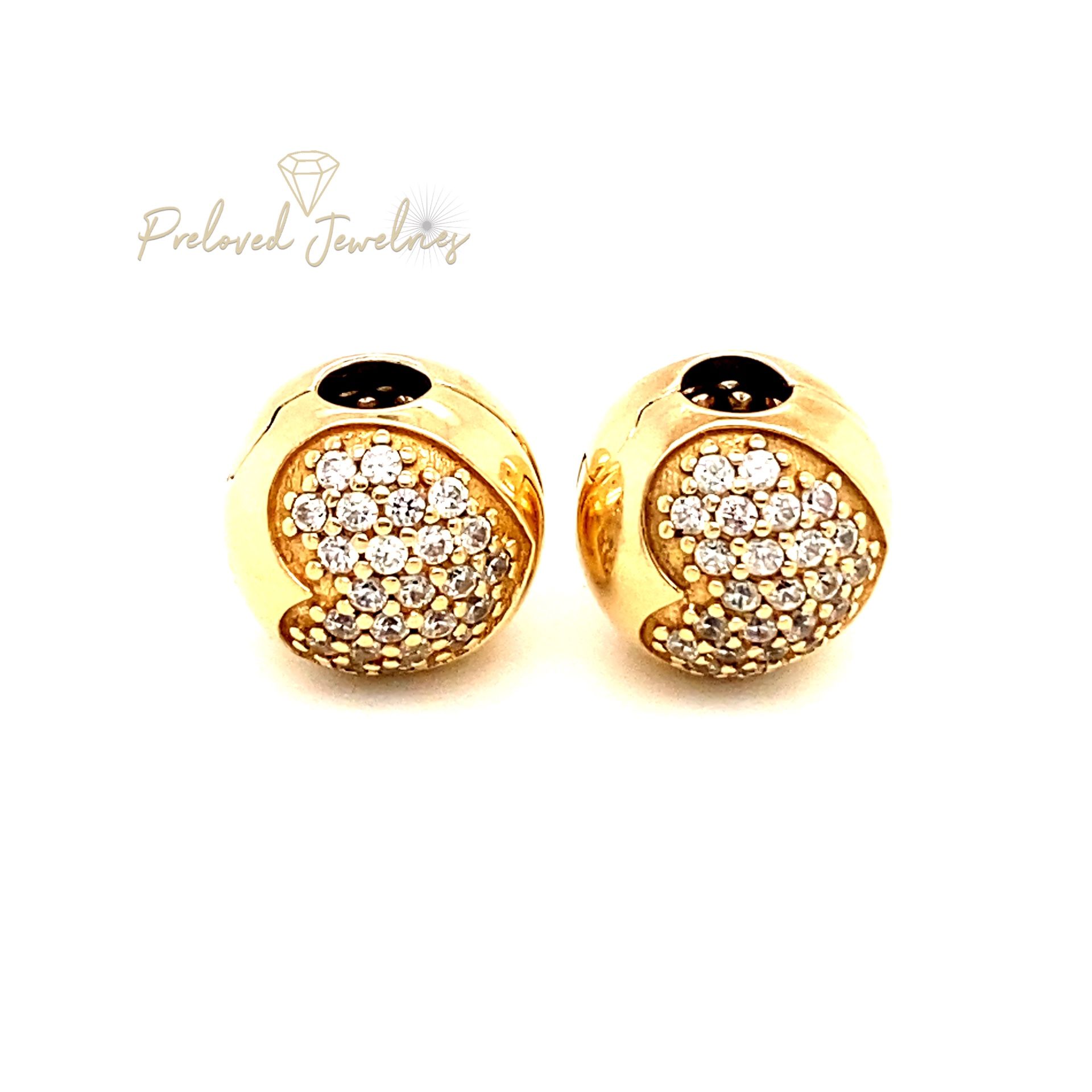 SPECIFICATIONS: Metal/Karat Gold: 14k Yellow Gold Metal Stamp: G585 Size: Small Condition: Preowned 2 Authentic Pandora 14k Yellow Gold Cz Love of My Life Cz Clips Est. Retail: $450 No Pandora packaging included. Note: Pictures are enlarged to show fine details of the product.