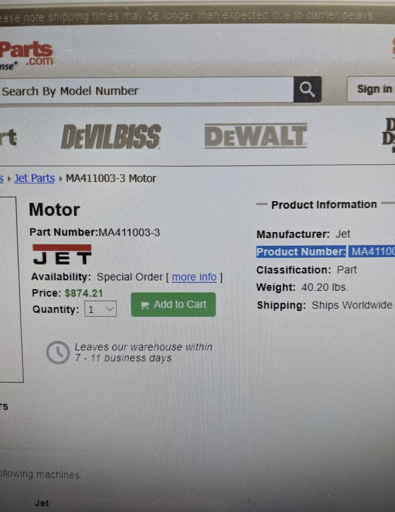 Jet motor for dust collector for any wood shop or industrial use. BRAND NEW ! Still in box Model : DC-1200A Description : MOTOR 2HP 3PH DC-1200A Part Number : MA411003-3