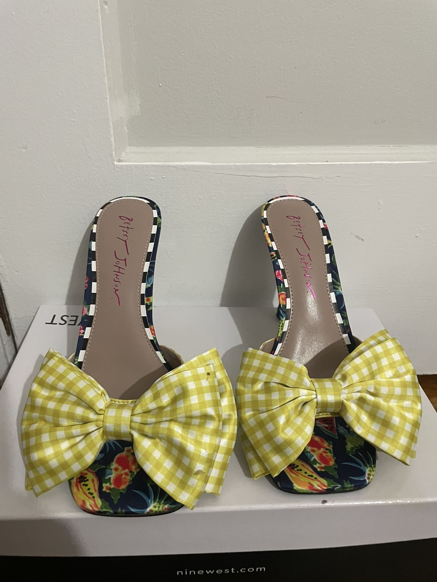 These new, never worn sandals by Betsy Johnson are the cutest! Featuring and adorable yellow and white satin bow. About as this Item -Betsey Johnson -Slip-on -Open toe -Layered bow detail -Flared heel