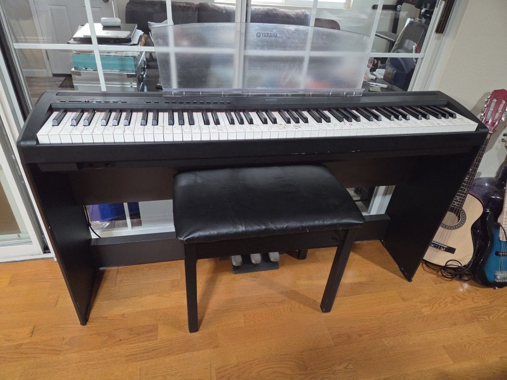 Yamaha P-95 Digital Piano Bench and pedals included The writing is taped on, it can easily be removed Weighted keys: Features a full 88-key GHS keyboard, which provides a heavier touch on lower keys and a lighter touch on higher keys, simulating the feel of an acoustic piano. Sound quality: Utilizes Yamaha's Advanced Wave Memory (AWM) stereo sampling to create a dynamic and rich sound. It includes 10 different instrument voices, such as grand pianos, electric pianos, organs, and strings. Portability: With a lightweight and compact design (around 25 lbs), the P-95 is portable and easy to move. Built-in speakers: The piano includes a built-in 12W stereo speaker system for practicing or performing without external amplification. Essential features: Comes with a built-in metronome, a recording function, and the ability to layer two sounds for added versatility. Connectivity: Includes two headphone jacks for private practice and MIDI in/out ports for connecting to external devices.