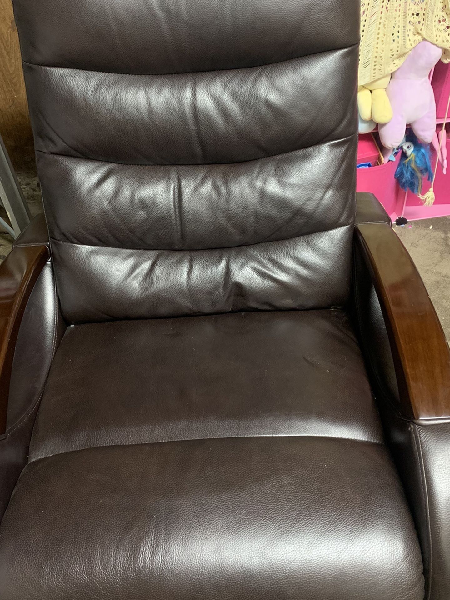 The chair is in excellent condition. Leather, push back chair, turns around. Hablo español.