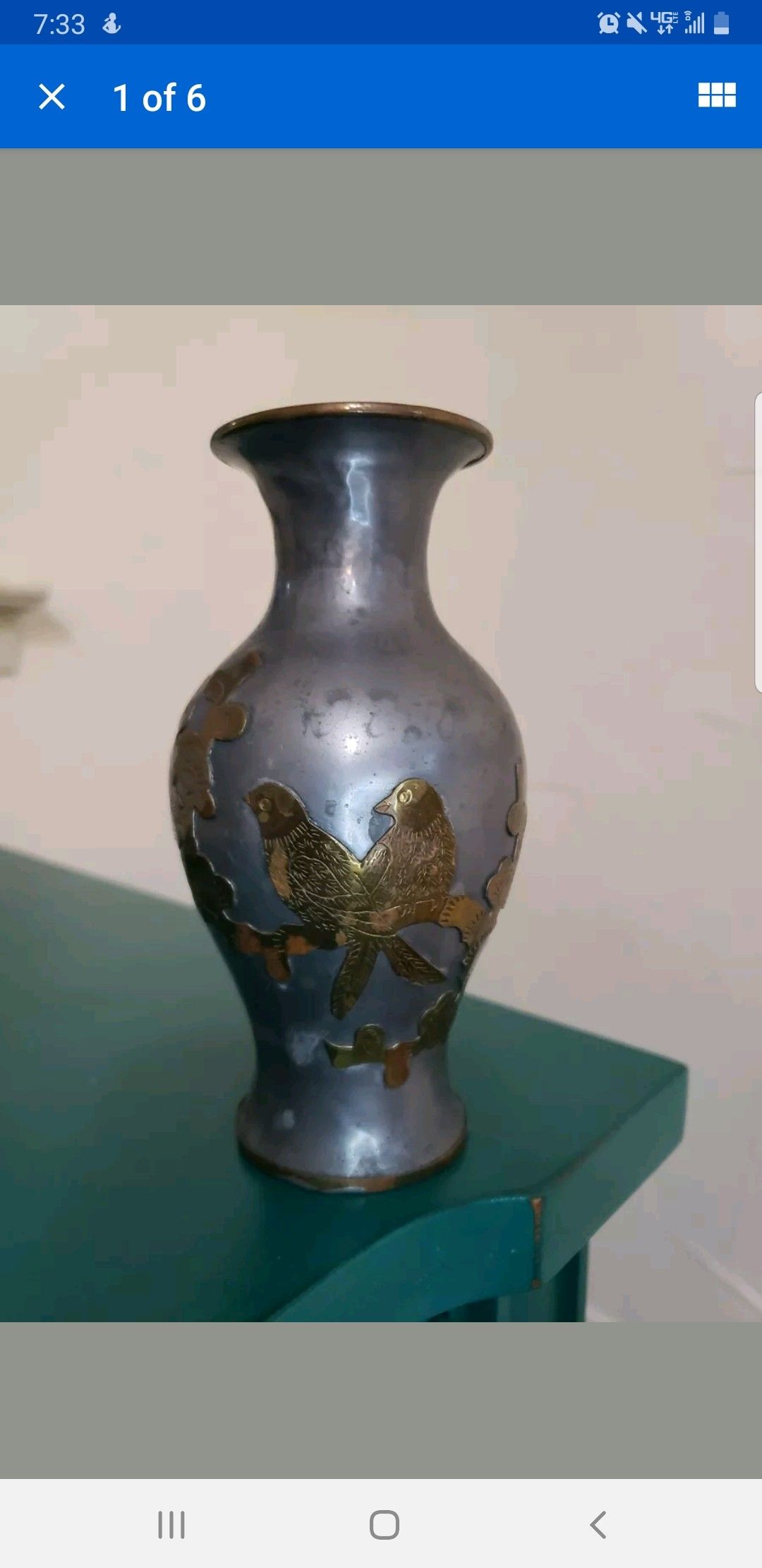 Vintage Asian style vase by James Mont...brass overlay of Birds. 5 1/2 inches tall