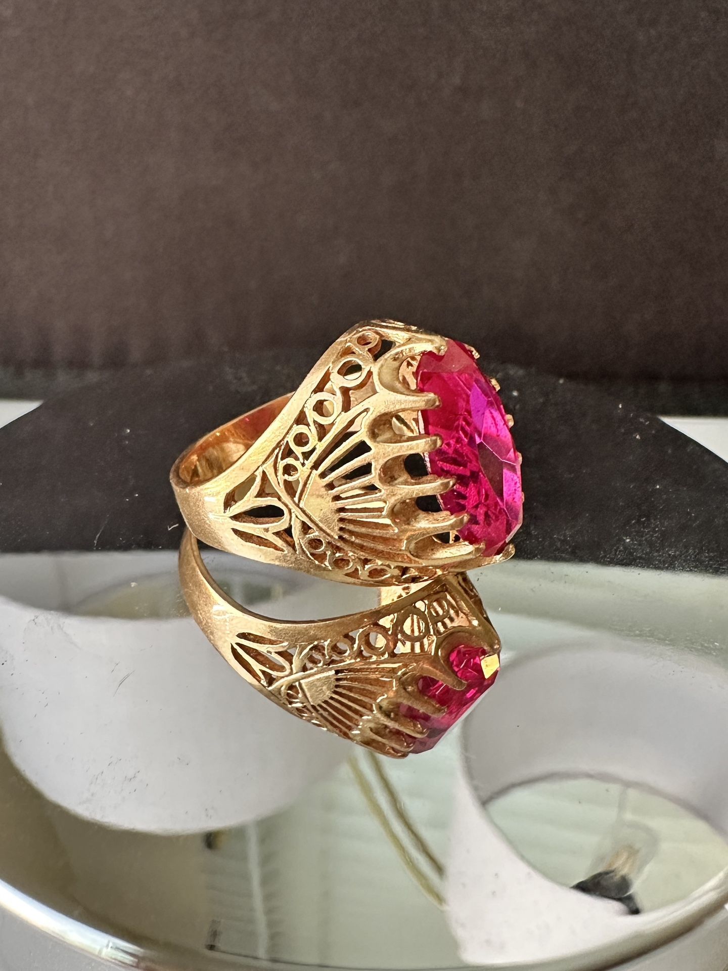 A stunning and authentic vintage ring from the Soviet Union era, crafted in high-purity 14K (583 standard) gold. This piece features a bold, ornate filigree design and a substantial, vibrant red, oval-cut stone. Era: Soviet Union (USSR), circa 1988. Metal Purity: 14 Karat (583) Gold. Hallmarks: Stamped with the official Soviet 583 star hallmark with the hammer and sickle, along with the maker's mark "8КЮ" (Kyiv Jewelry Factory, year 1988) and the Kyiv assay inspection letter "K". Design: Features an intricate, detailed openwork setting, a popular vintage style sometimes referred to as the "Shahinya" or "Krabik" design in post-Soviet countries. Condition: In excellent vintage condition with minimal signs of age or wear. Please refer to photos for details as they are part of the description. This rare, signed piece is a fantastic addition for any collector of vintage or Soviet-era gold jewelry.