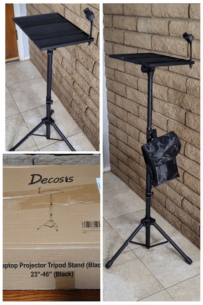 New in box, Height adjustable Projector stand $20 Firm, pick up only Decosis Projector Stand Tripod Adjustable, Laptop Height from 23.5 to 46.5 inches with Gooseneck Phone Holder, Floor for Office, Home, Stage, Studio, DJ Racks Holder Mount, 23.5inch-46.5inch γπΊπππππ π°πππππππππππ & πΊπππππγ: It may take you 5-10 min to install according to attached accessories and instructions manual(No extra tool to set up). Before using the projector tripod, tighten the lock for each connection to ensure more stability. γπ΄ππππππππππππππ πΊπππππγ: The enlarged top tray(15" x 11") supports various sized devices, such as projectors, laptops, music players, and DJ equipment. This tripod stand is suitable for home party, conference, speech, report, DJ, office. γπΎππ πππ π¨π ππππππππ π―πππππ & π»πππγ: The projector tripod stand is easily adjusted from 23 to 46 inches for height to meet personal needs. The top tray can be easily tilted within a range of 180Β° to provide a comfortable viewing angle. Maximum load capacity is 22 lb. γπ·πππππππ & ππππ ππππγ: Detachable design makes the projector holder easier to store and carry out.After disassembled by section, they fit perfectly into the provided bag. Sponge pads and elastic belts enhance the stability of outdoor & indoor use.