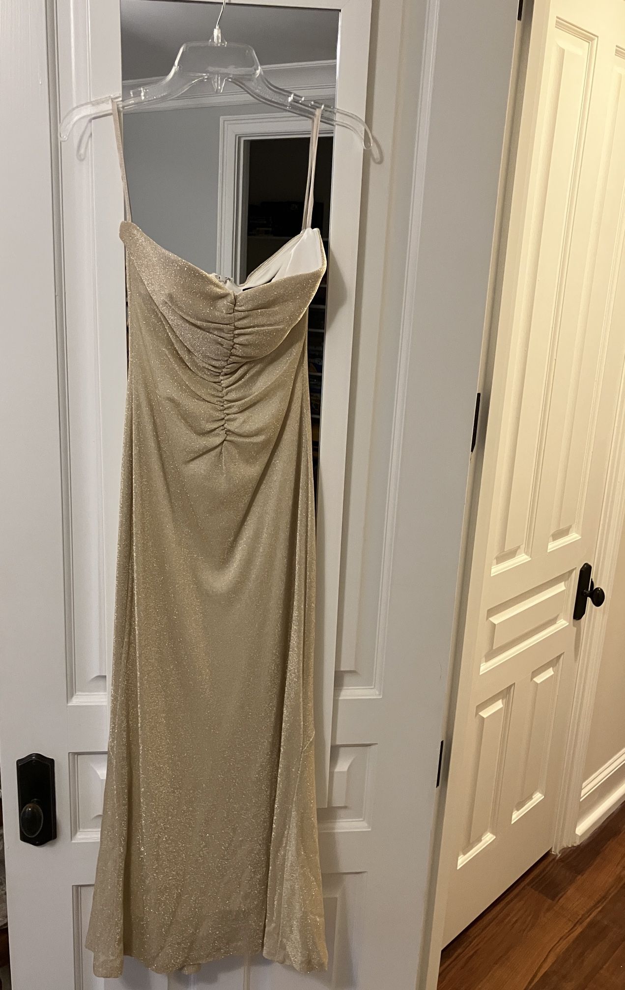 This shimmery gold color like, size 2, never worn, strapless gown (no pads in the bust area ~size 32) will look stunning on you! Smoke/Pet/Stain/Tear free. Cash only and thanks ! Check my other posts for classy styles!
