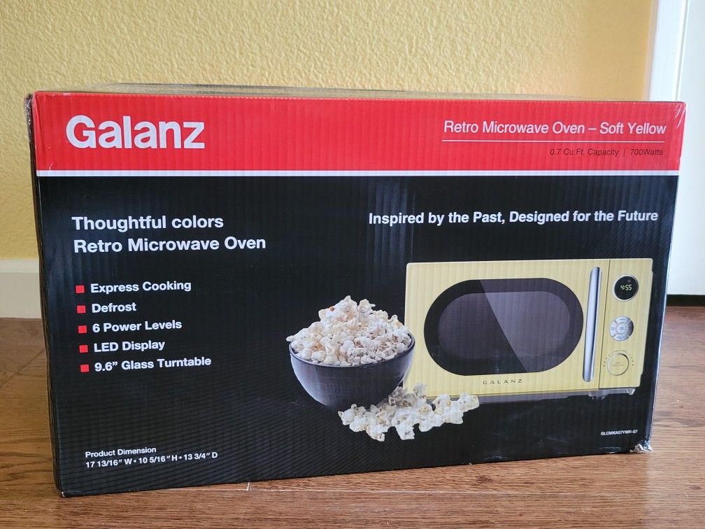 GALANZ YELLOW RETRO-STYLE 0.7 Cu. Ft. 700 MICROWAVE COUNTERTOP OVEN, bought at Walmart but never wound up needing it. Box has never been opened. Important: The canary yellow color is discontinued, so it's hard-to-find new.