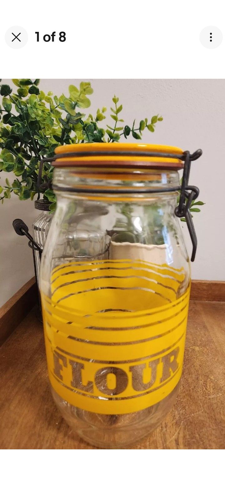 Vintage MCM Carson Glass 2L Flip Top Flour Canister. Excellent Condition, Colorful Yellow Graphics are Awesome. CASH ONLY PLEASE
