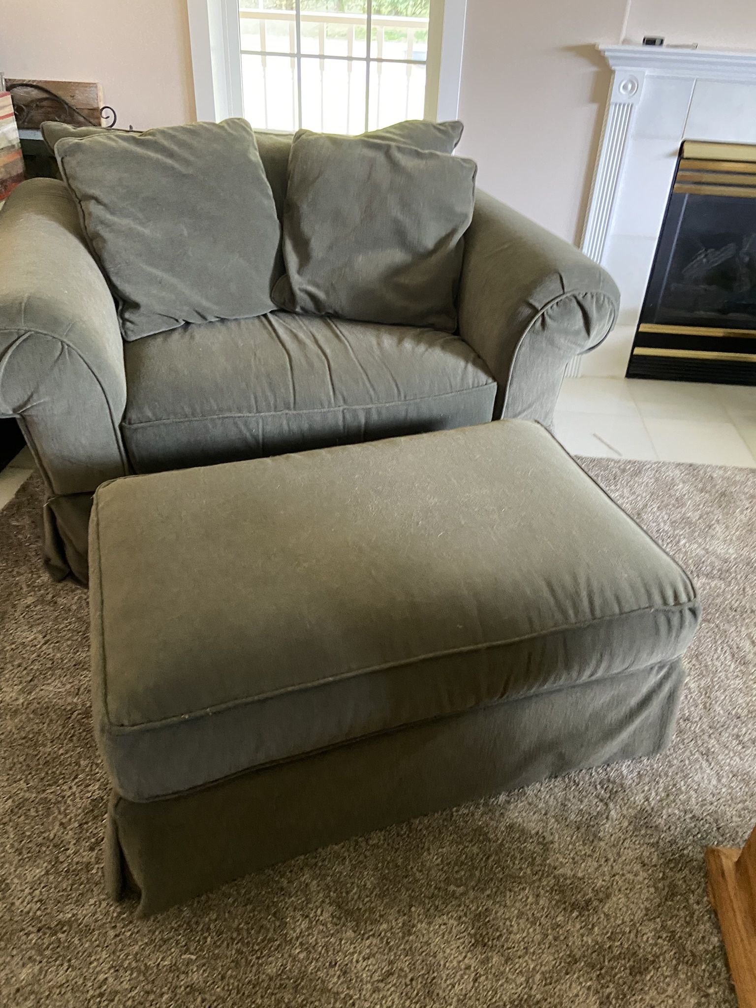 Lt green love seat and oversize chair with ottoman Good condition.