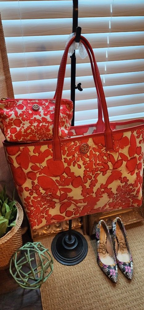 Large Salmon color, leaf pattern Tory Burch with gold emblem. Make up bag is included. Both in great condition.