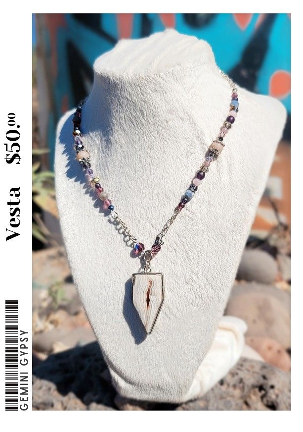π Vesta π Banded Agate with Druzy Crystal Core in a Silver Pendant Frame $50.00 Every single necklace from GeminiGypsy is 100%handcrafted and forever unique, meaning no one else will have a stone like the one you choose. I have spent countless hours scouring all parts of the Arizona desert searching for the perfect specimens, which means none of my pieces are ever bought. Each one is found, cut, shaped, polished, wrapped and entwined with a one of a kind strand by yours truly. Shipping available or local pick up near 43rd Ave and Pinnacle Peak.