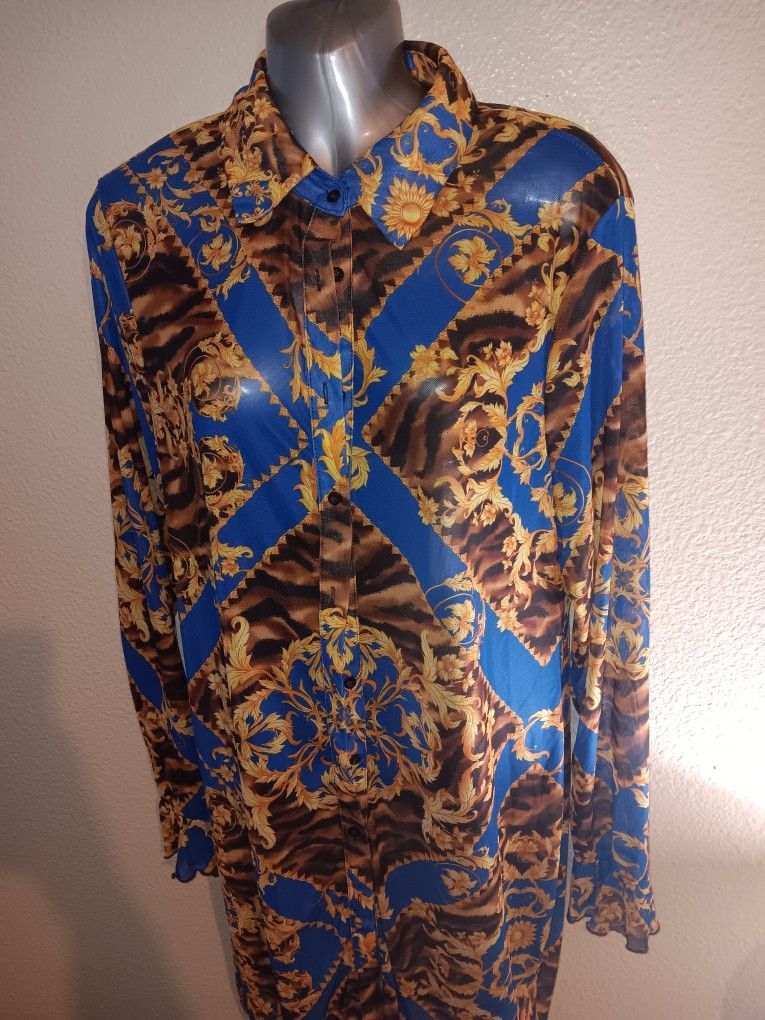This is a blue and gold Versace inspired mesh dress. The dress is a long sleeve mesh dress it's also knee-high.