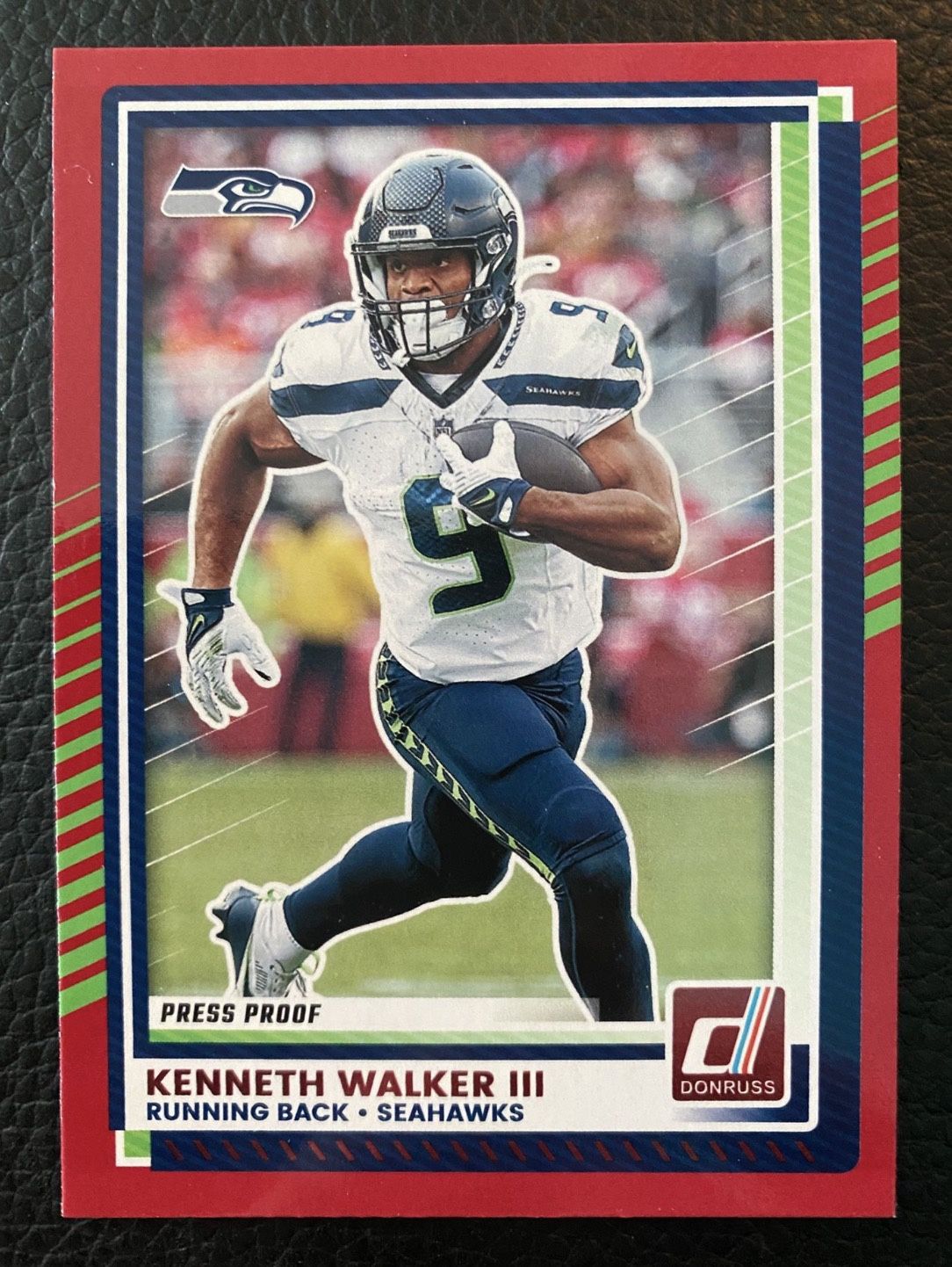 Up for sale is a Kenneth Walker III 2025 Panini Donruss Football #187 PRESS PROOF RED INSERT! SEAHAWKS! All cards come in a top loader w/penny sleeve.