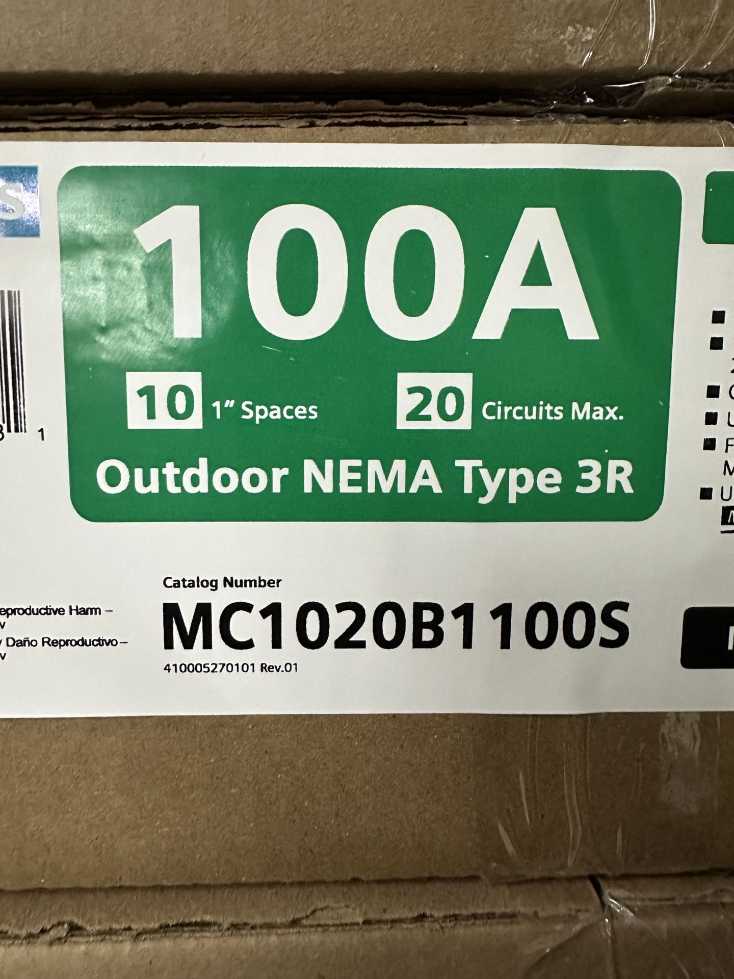 Model: MC1020B1100S Outdoor Rated – NEMA Type 3R Factory Installed 100 Amp Main Breaker Perfect for: • Panel upgrades • Garage / ADU installs • Small residential service • Overhead service entrance Specifications: ✔ 100 Amp Main Breaker (Factory Installed) ✔ 10 Spaces / 20 Circuits Max ✔ 1-Phase, 3 Wire, 120/240V ✔ 22,000 AIC Rated ✔ Surface Mount ✔ Outdoor Rated (Rain Tight) ✔ UL Listed ✔ Accepts Siemens & Murray breakers Brand new in box. Serious buyers only. Message me if you’re ready to pick up.