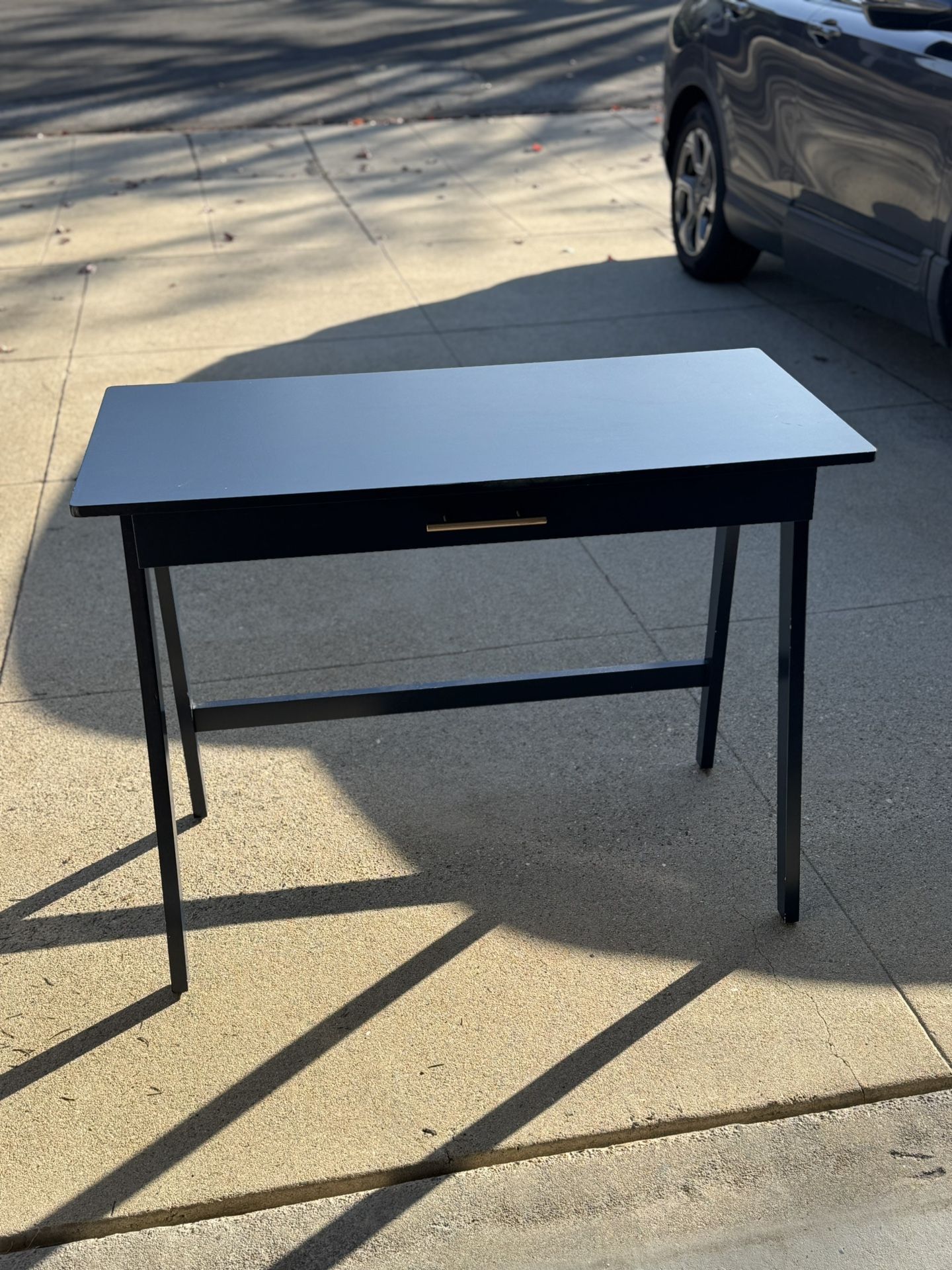 ✨ Modern & Glam Navy Blue Writing Desk ✨ This beautiful, stylish desk is perfect for a home office, student workspace, or even as a sleek vanity or console table in a hallway. It has a chic, minimalist design that fits well with Modern, Glam, or Mid-Century decor. Details: • Color: Deep Navy Blue • Feature: One spacious pull-out drawer with a sophisticated brushed gold/brass pull. • Style: Resembles popular, high-end pieces from Wayfair brands (e.g., Everly Quinn, Wrought Studio). • Condition: Excellent, like-new condition. Very clean and sturdy.