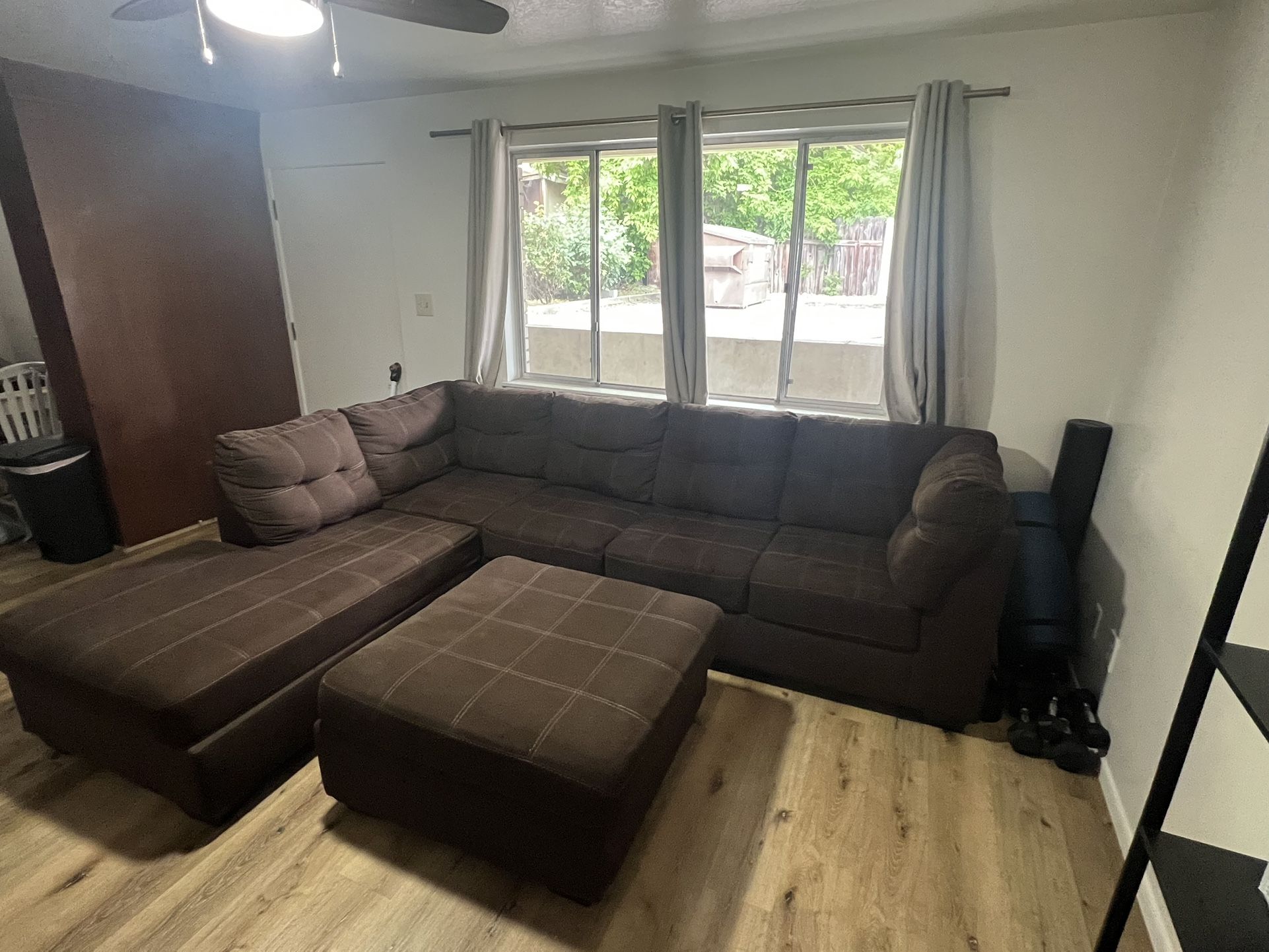 Brown sectional couch with ottoman