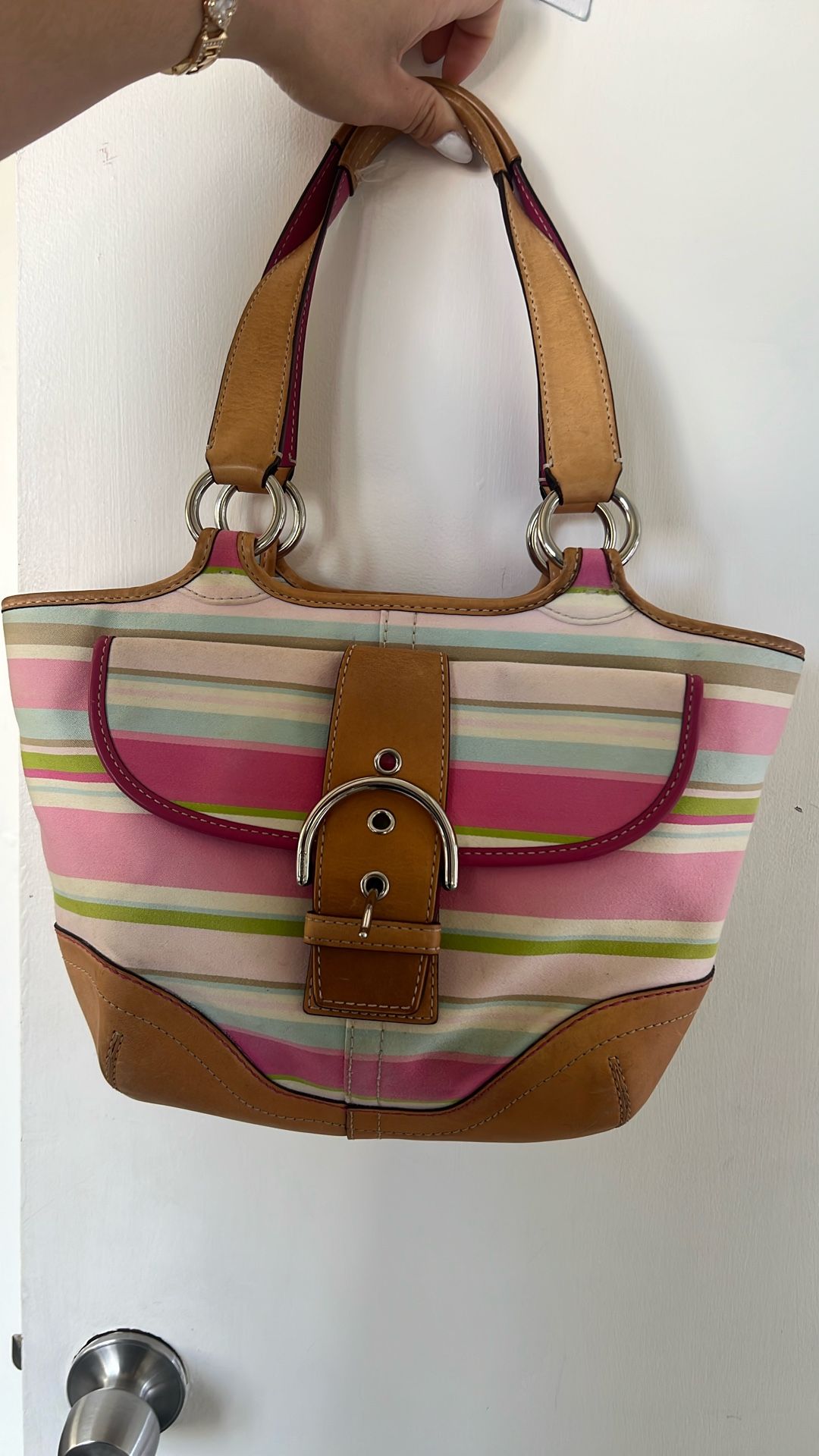 vintage Coach Hampton Soho multicolor striped canvas and vachetta leather small tote bag, style no. 1888 or 1889.