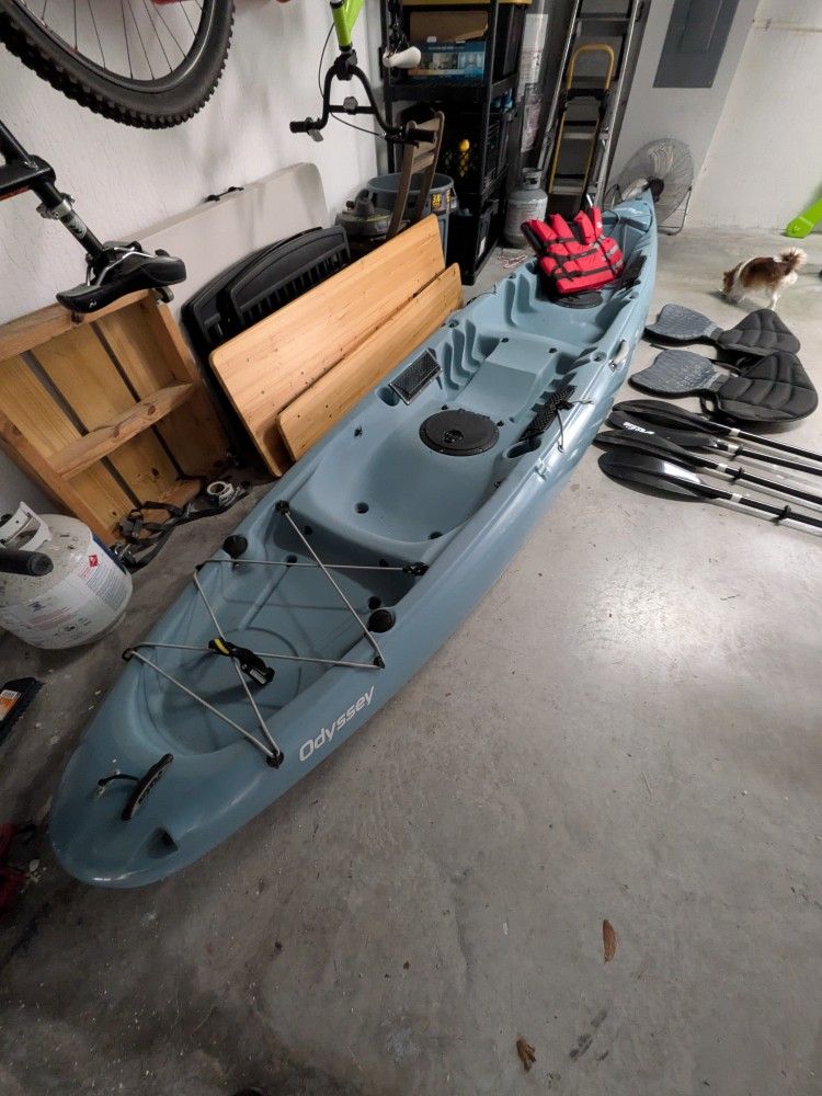Tandem Hobie kayak used a handful of times. Comes with seats, Hobie paddles, an adult life vest, child life vest, and brand new unopened kayak cart.
