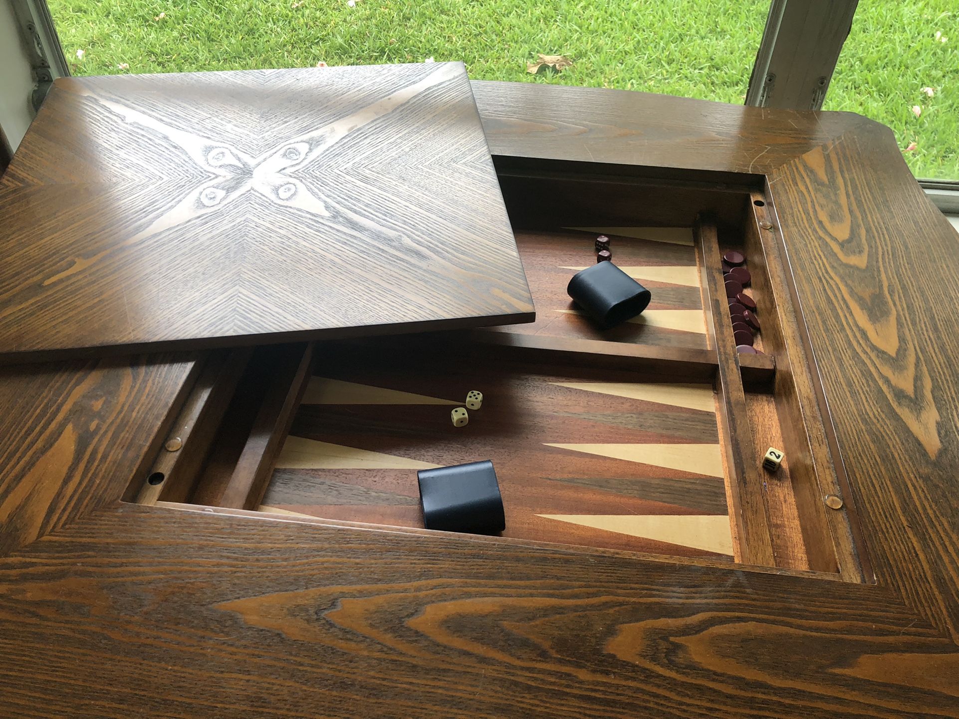 Beautiful wood table. Center pops up for backgammon. With top on great for dining games, puzzles