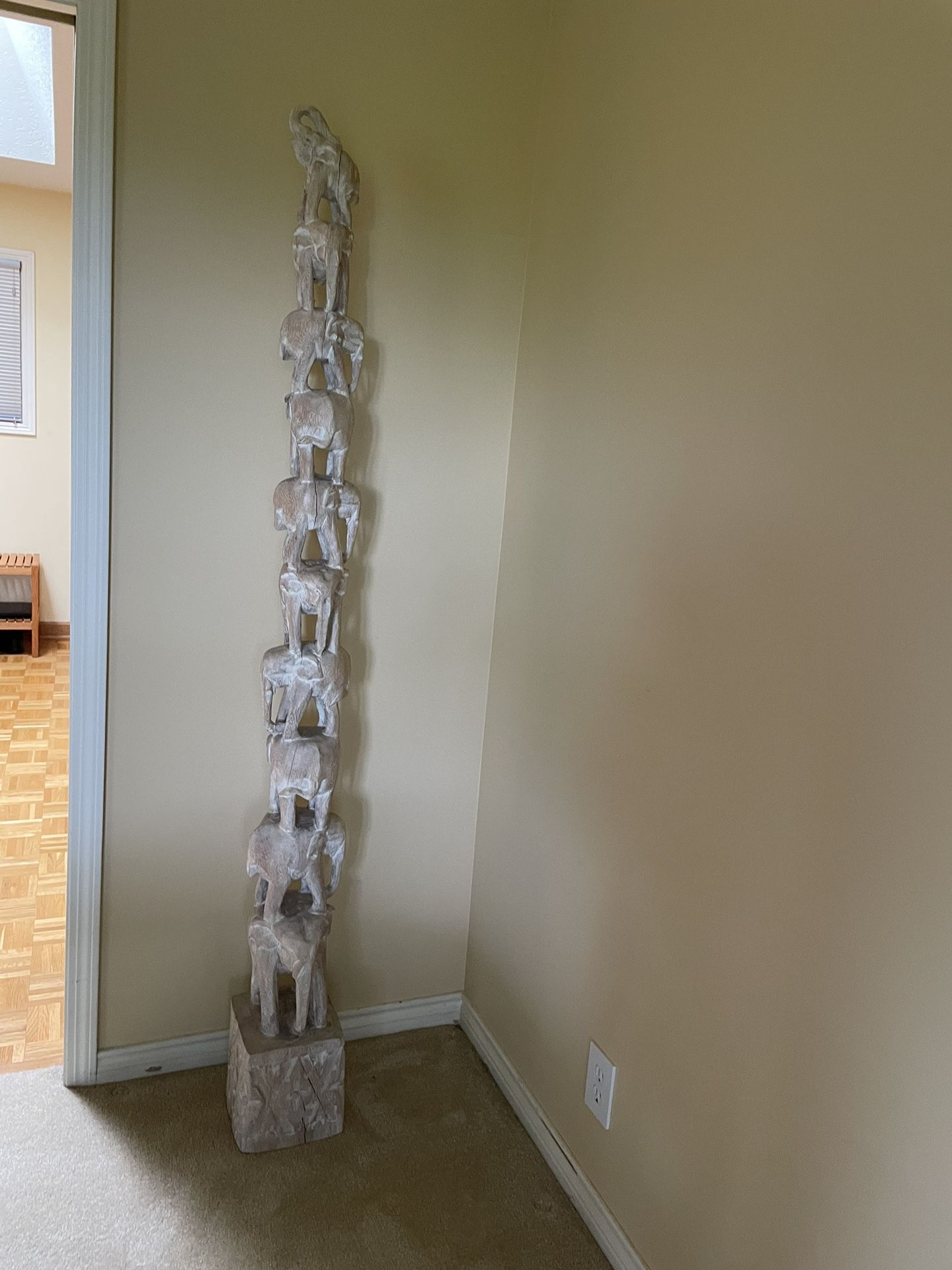 The hand-carved sculpture wooden lucky Elephants Wood Tiered Tower The Largest at the bottom to the tallest on top Dimensions 8”W X 75” H For Home, Office, Living Room, Dining Room