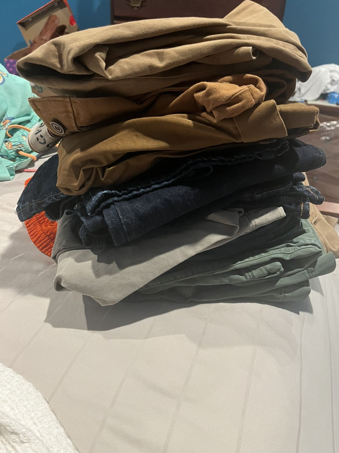 31x32. 9 total pairs. Some not worn with tags. Others worn a few times. 2x jeans. 4x assorted tan khaki. 1 each gray,blue, green khaki