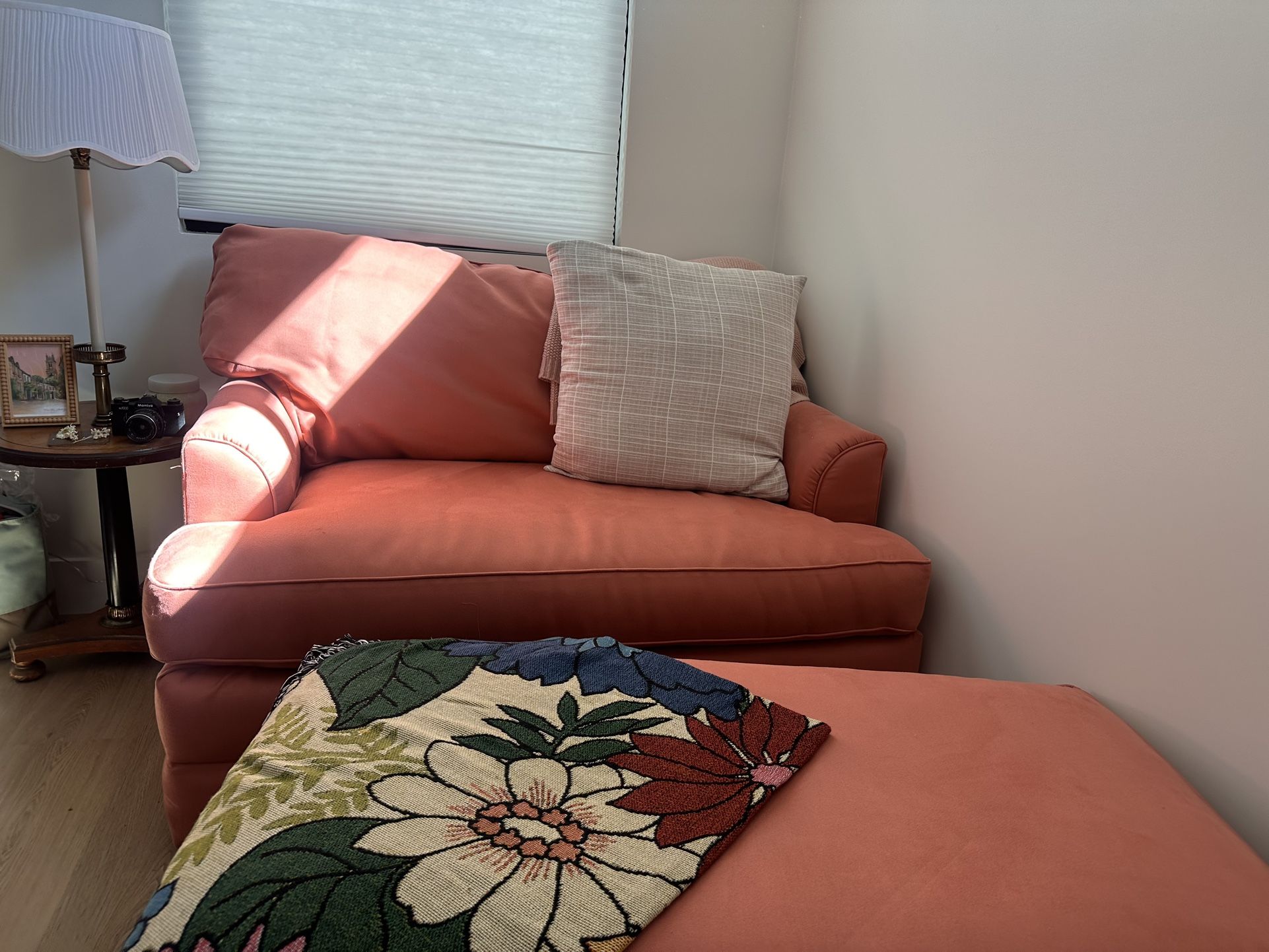 This is a large coral pink chair (loveseat) with a fold out twin bed. Mattress included. The ottoman opens for storage. In full working order lightly used.