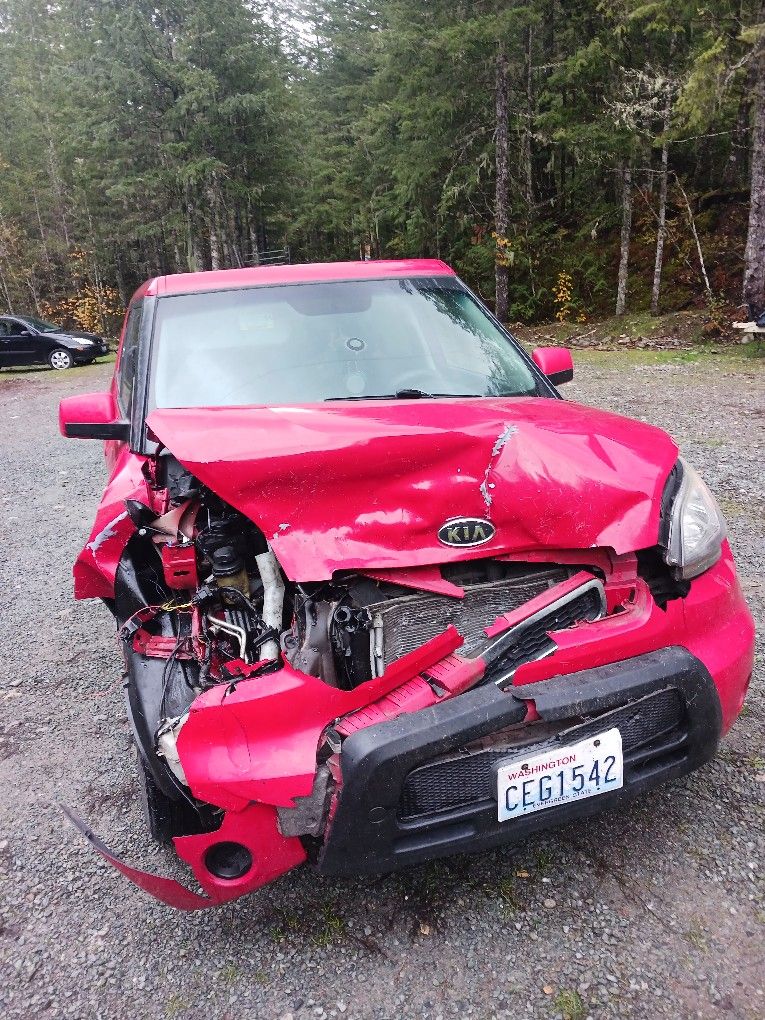 2010 Kia soul, I hit an elk so there's quit a bit of body damage but the motor, transmission, alternator ect. Still a great car I loved driving it! I think it's fixable but if not you could part it out. I have title in hand