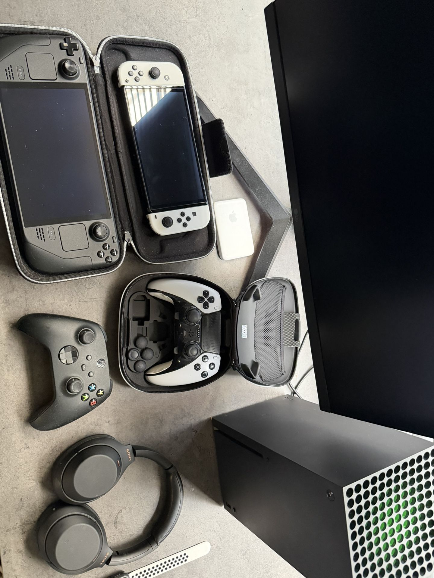 Trying to sell a lot of unused technology around my place. Would prefer to sell it all together for 600$ this week - OLED Steamdeck 1 TB - OLED Switch 64gb - Xbox one X w/controller - Sony WH1000XM4 - Apple Watch Series 3 - Apple iPhone Air MagSafe battery - LG Monitor 24GN650 - PlayStation dualsense edge controller