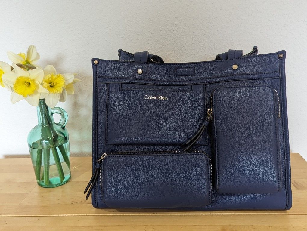 Calvin Klein - Ember Tote Color- Medieval (navy/ Dark Blue) Size - Tote Magnetic snap closure Silver-tone hardware 1 exterior slip pocket 2 exterior zip pockes 3 interior slip pockets Reversible/Multifunctional for additional look and color of bag