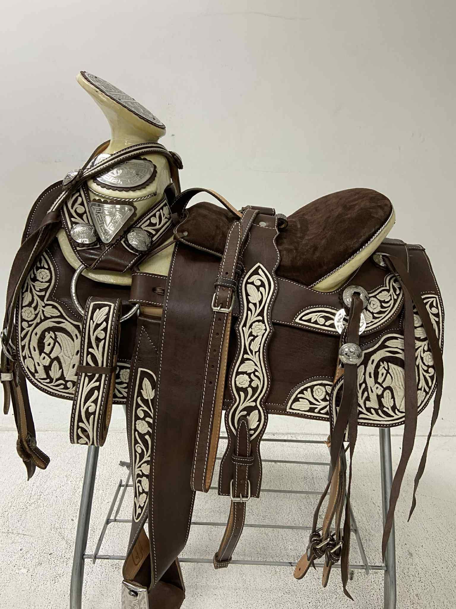 Montura charra 100% pitiada original con herraje y medio fuste plateado, lista para recoger o entregamos a domicilio, envía mensaje para más información
