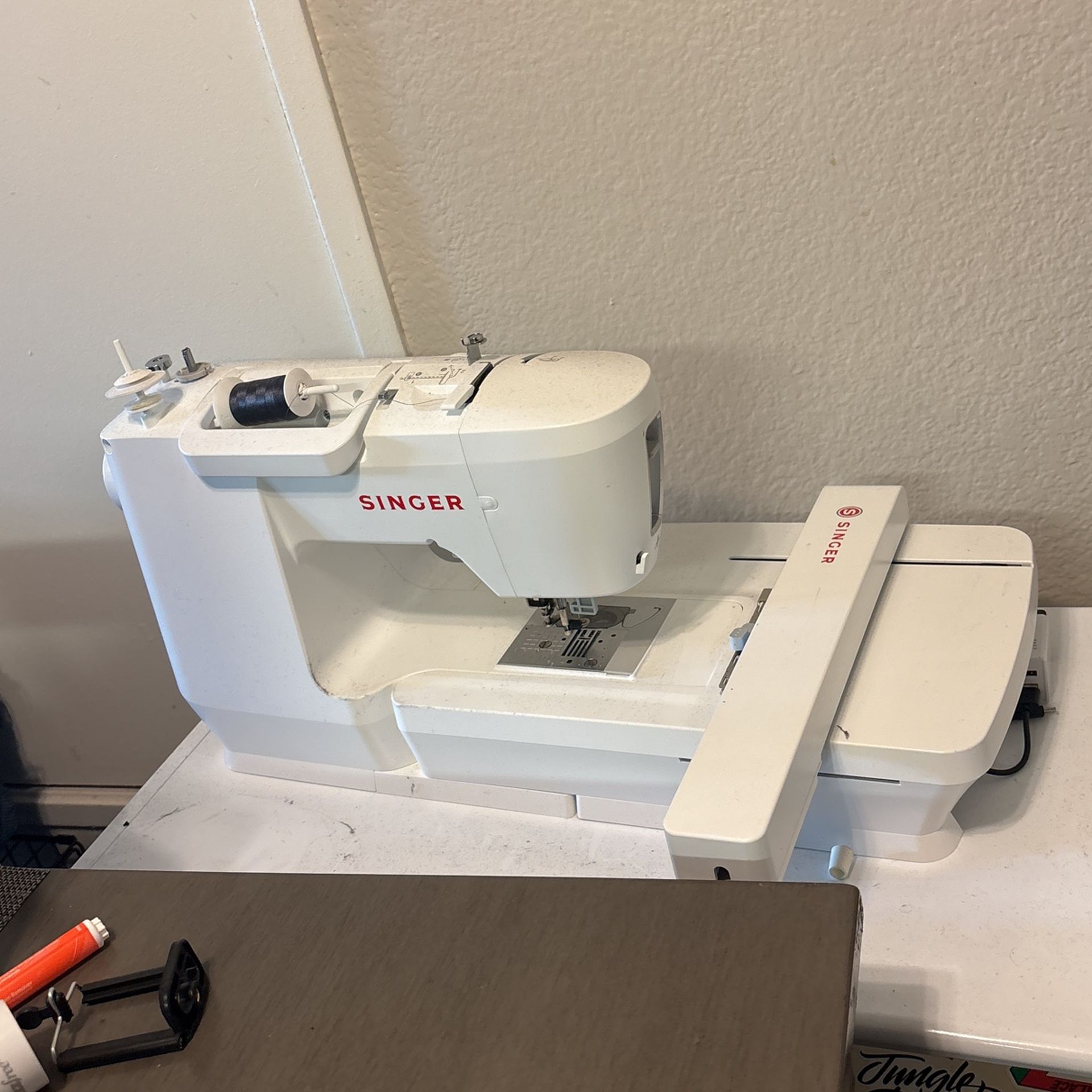 Used but works like a champ. It is taking up space since I don’t use it anymore. Singer sewing/embroidery machine Includes: -2 hoops -embroidery arm -sewing arm + foot pedal -threads -bobbins etc.