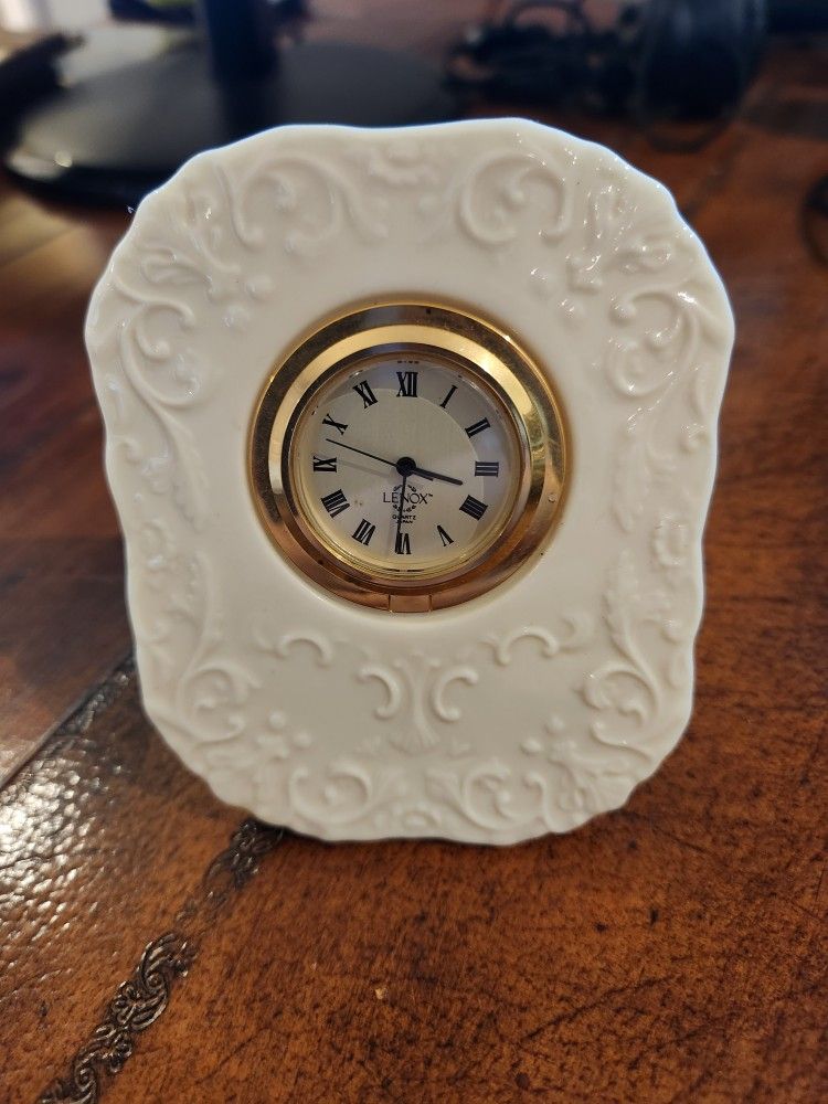 Elegant Lenox table clock with Roman numerals. Measures 3"W x 2"D x 4"H