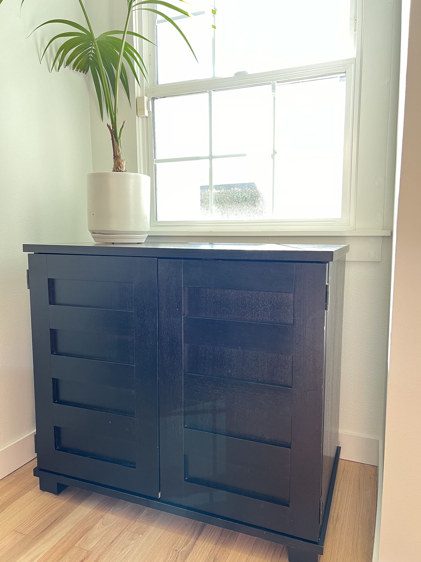 Crate & Barrel Incognito Ebony wood cabinet with hideaway desk. Original price over $1000. Used and in great condition. We loved this piece, but are converting room to mixed use living space. Has pull out desktop with drawers and shelves for storage. Bottom drawer has tracks for use as file cabinet. Dimensions: 36.75” L x 21” D x 32.375” H