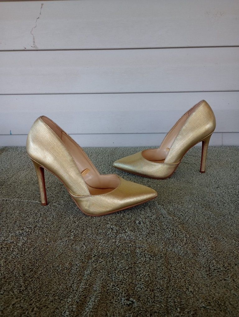 Women’s gold size 6.5M Jessica Simpson pumps. In good condition, needs a little cleaning has no rips or tears, does not come with the original box. 4" 1/4 heel height, see all pictures for more details
