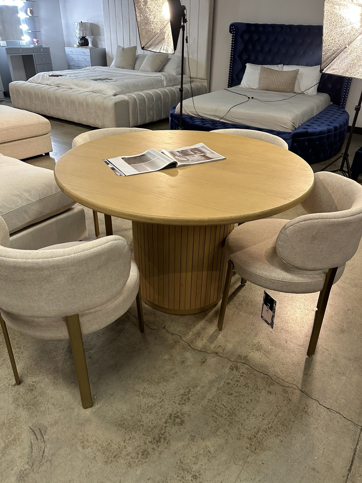 Mid Century Dining Table with Natural Oak Wood Set & Cream Performance Linen Chairs $1,445 • 48” round table • real natural oak finish • performance linen chairs ( more chairs available ) • gold legs & preassembled design • fluted wood base & gold trim • + 2 year manufacturer warranty Shop Top QUALITY Designs BELOW Retail as we clear containers full of the latest designs 10%-70% OFF. This Item Qualifies for FREE Delivery ✅ Come view it in person or message me for FINANCING Options APPLY TODAY. 💳 More options available upon request 👍🏻
