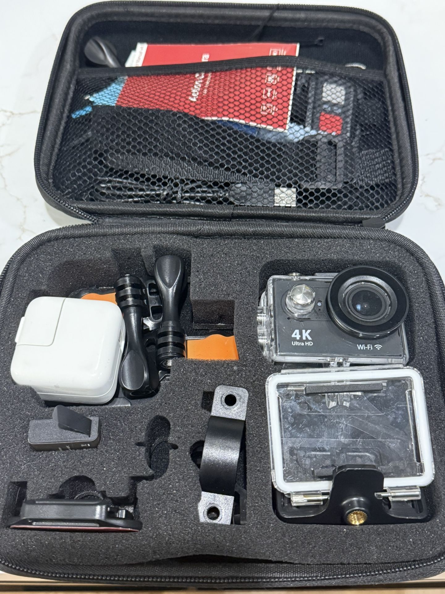 This is a 4K action camera (often called a GoPro clone or knock-off). Works great - only used once until I switched to an IPhone recording mount. Includes manuals and carrying case, • 4K Ultra HD video recording. • Built-in Wi-Fi for connecting to a phone app (to control the camera, preview, or transfer files). • Comes with a full accessory kit, including: • Waterproof housing/case (usually rated to 30–40 meters). • Wrist-worn 2.4G wireless remote control (for starting/stopping recording hands-free). • Various GoPro-compatible mounts (helmet, bike, clip, adhesive, etc.). • Charger, batteries, lens cloth, and extra frames or straps. Will include a 32gb micro SD card.