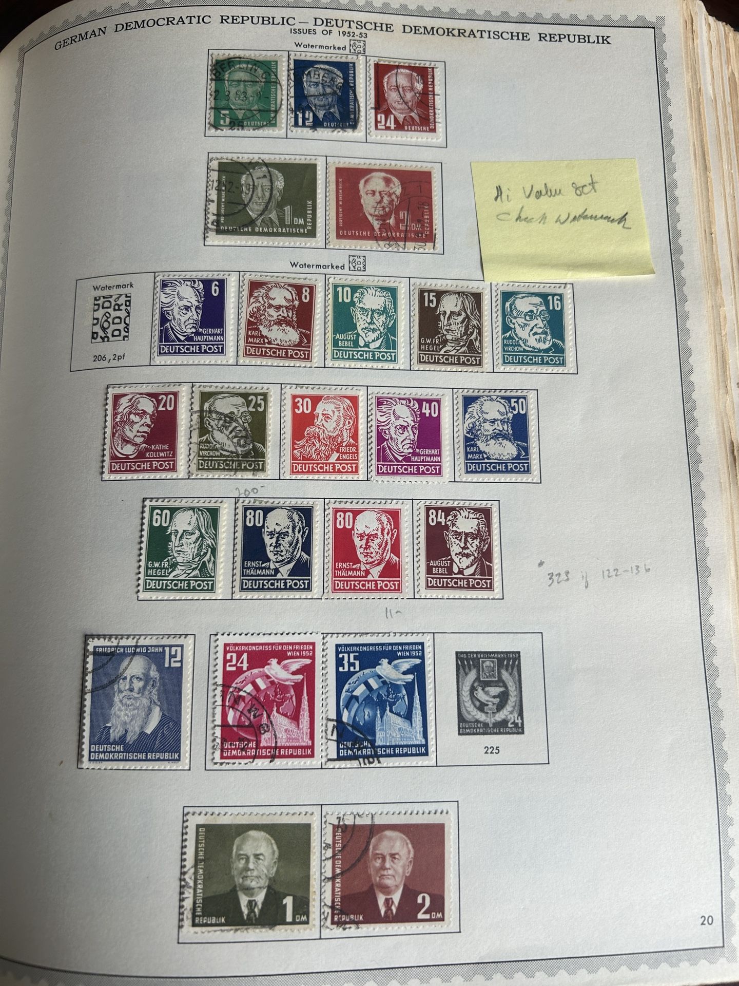 Germany π©πͺ German democratic Republic, postage stamp collection of 24 stamps issued 1952 to 53. Watermarked. Mostly mint condition unused with hinge the rest very good condition used with hinge. High value set at center three rows selling for $63. Probably over $80 with the stamps on this page nearly complete missing two. One stamp shy of a complete watermark set at center mint condition unused. Great value great collection. Hard to find stamps.